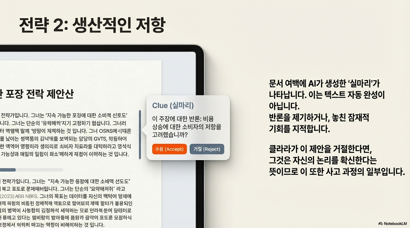 2. 생산적인 저항 제공 (Productive Resistance): AI는 정답을 제시하는 대신 사용자의 주장에 반론을 제기하거나 오류를 찾아내는 **'실마리(Clues)'**를 던집니다. 이 실마리는 무조건 따라야 하는 명령이 아니라, 사용자가 비판적으로 수용하거나 무시할 수 있는 '생각의 미끼'입니다.