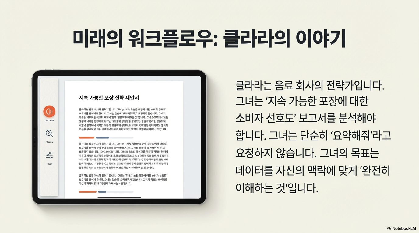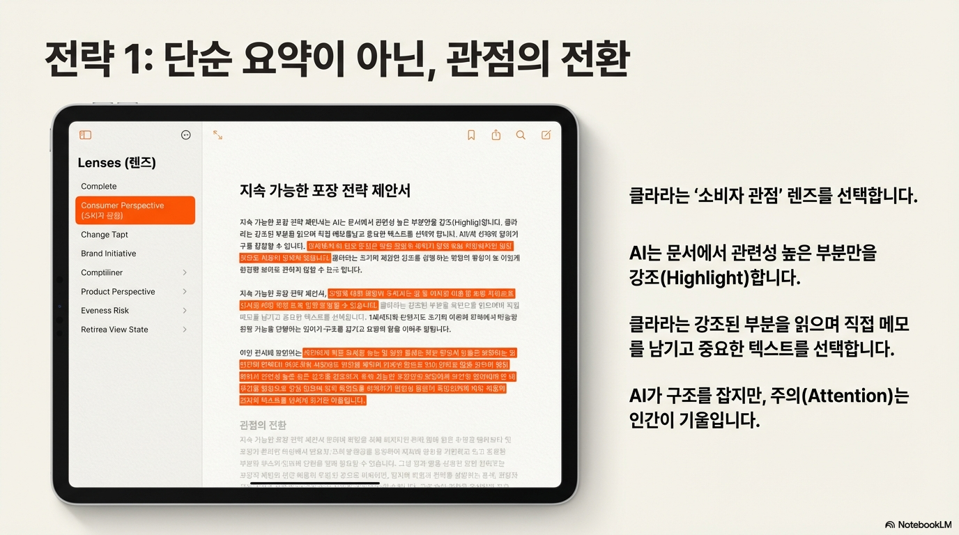 1. 물질적 참여 보존 (Material Engagement): 클라라는 단순히 요약본을 던져주지 않습니다. 대신 사용자가 특정 관점(Consumer View 등)으로 문서를 조망할 수 있는 '렌즈(Lens)' 기능을 제공합니다. 사용자는 여전히 문서를 읽고 강조 표시를 하며 전략적으로 참여해야 합니다.