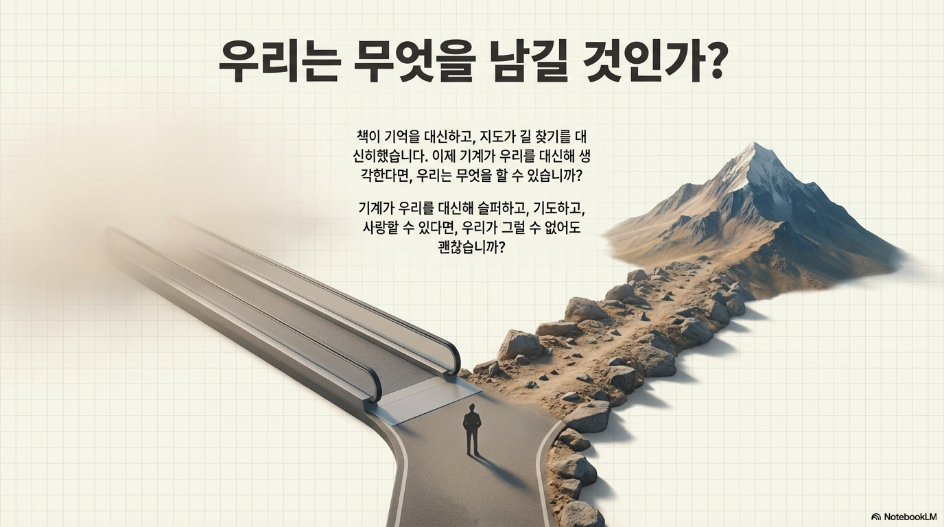 과거에 글과 인터넷이 기억을 대신하고 지도가 길 찾기를 대신했을 때도 우리는 비슷한 질문을 던졌습니다. 이제 기계가 생각을 대신하는 시대, 우리는 다시 물어야 합니다. "우리가 스스로 생각할 수 없어도 괜찮은가?"