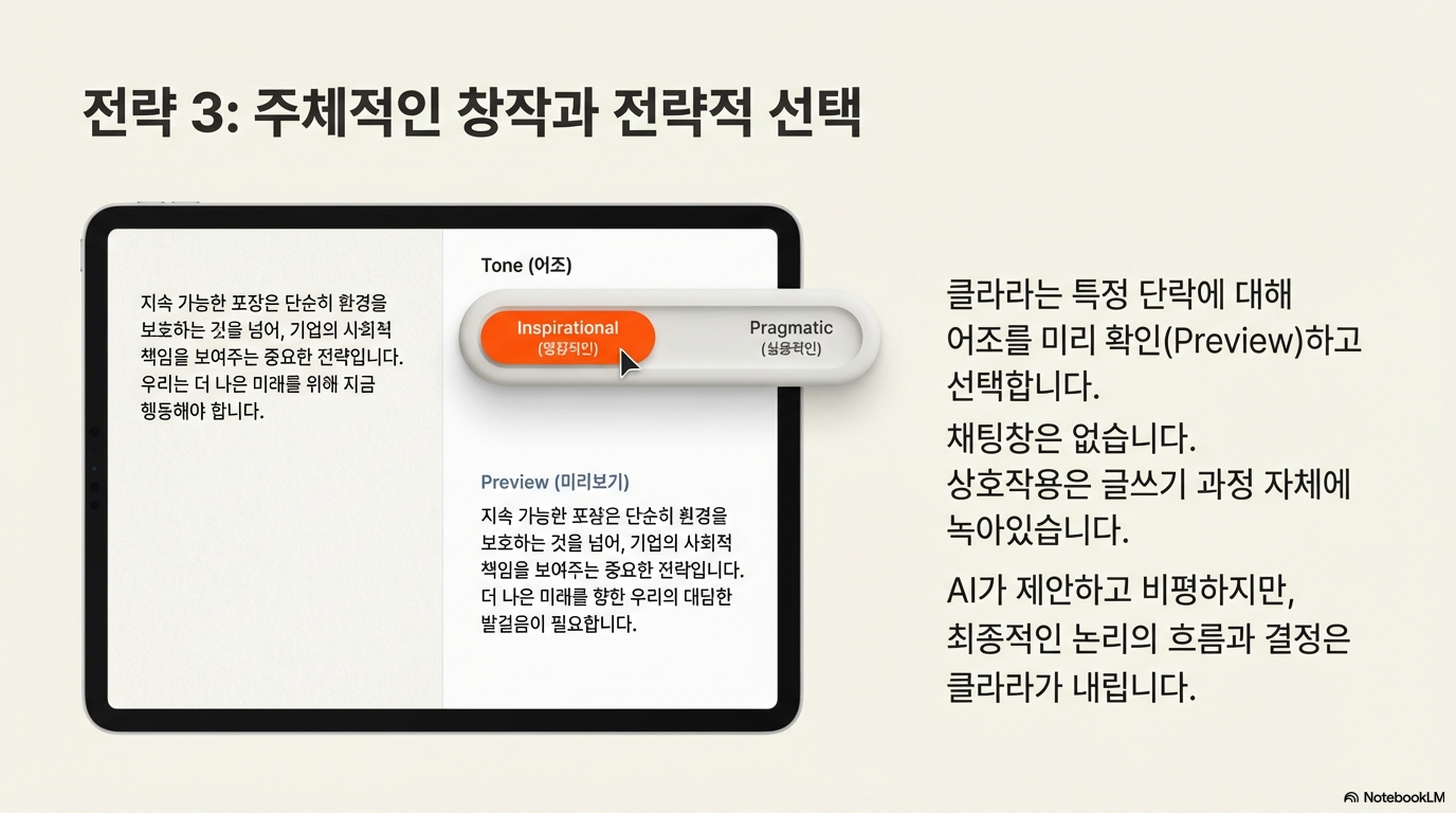 3. 메타인지 기능 촉진 (Facilitating Metacognition): 클라라의 인터페이스에는 **'채팅창'**이 없습니다. 말을 걸어 일을 떠넘기는 대신, 사용자가 직접 구조를 잡고 결정을 내리는 과정에서 AI가 조용히 대안을 제시할 뿐입니다. 이는 사용자가 작업의 주도권을 유지하도록 강제하는 철학적 설계입니다.