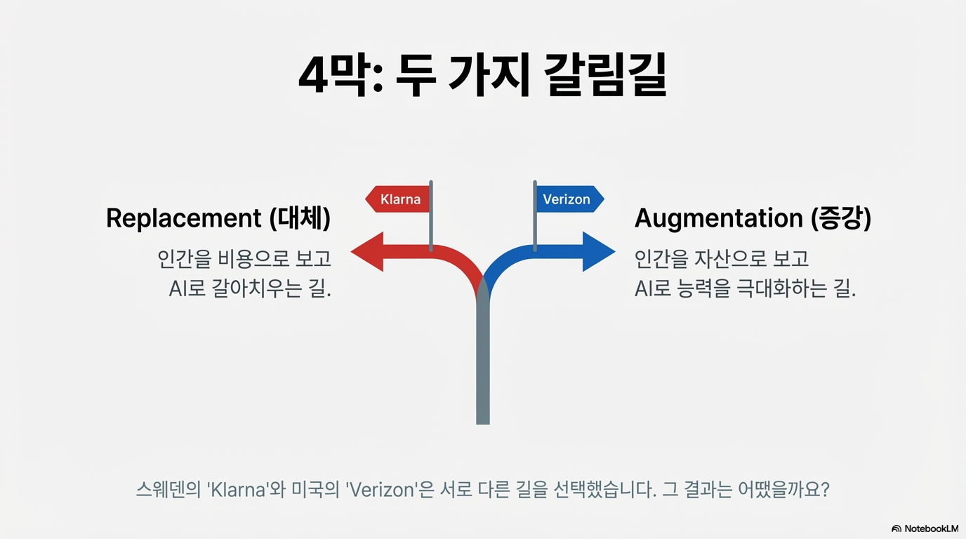• 클라르나(Klarna)의 패착: 스웨덴 핀테크 기업 클라르나는 5,000명 이상의 직원 중 40%가 넘는 인원을 감축하며 AI 챗봇을 전면에 내세웠습니다. 초기에 주주들은 비용 절감에 환호했지만, 고객 대응의 질이 급격히 떨어지며 브랜드 가치 하락이라는 부메랑을 맞았습니다.