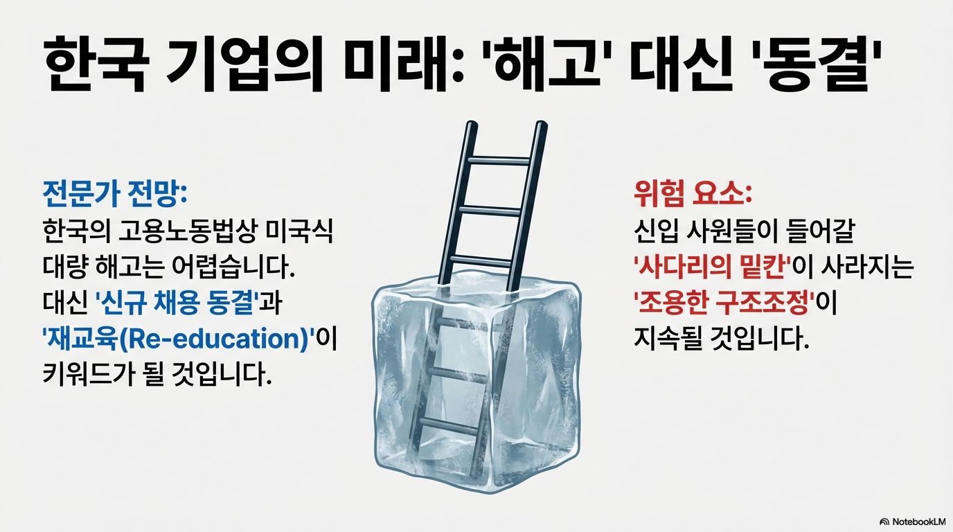 한국은 근로기준법상 대규모 해고가 어렵지만, 기업들은 이미 다른 방식으로 대응하고 있습니다. 지난 연말, 대외적으로 보도되지는 않았으나 국내 주요 기업(엔터프라이즈)의 임원 레벨에서는 이미 한차례 거센 구조조정이 지나갔습니다. 실무진에게는 '재교육(Reskilling)'이라는 이름으로 유예기간을 주면서도, 의사결정권자부터 AI 시대에 맞는 인물로 교체하는 '보이지 않는 숙청'이 일어난 것입니다.