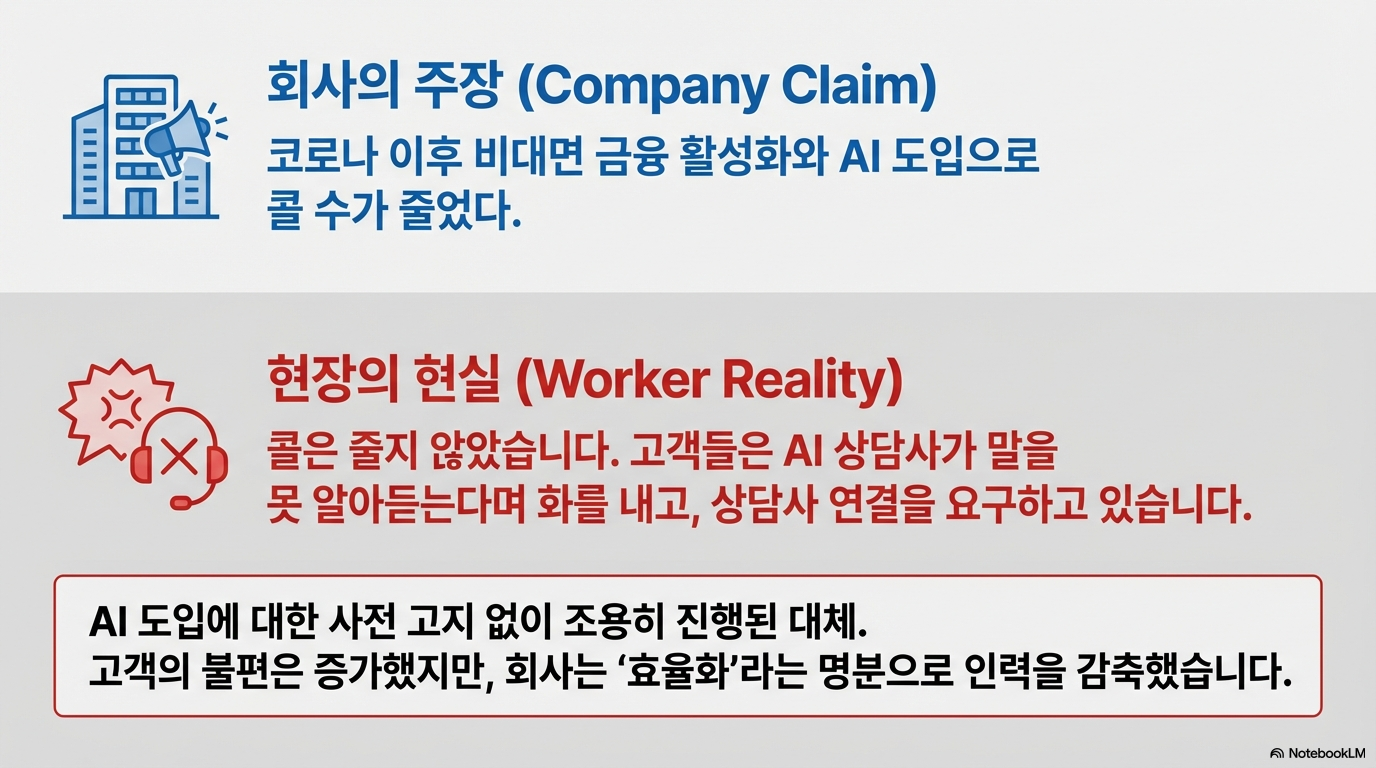 "앞으로 뭐 하고 살지... 내가 여기서 10년 넘게 일했는데 이제 나가면 뭘 할 수 있을까. 다들 말을 잇지 못했습니다. 무엇보다 충격적인 건, 우리도 모르는 사이에 AI 상담사가 도입됐다는 사실이었어요. 고객들이 'AI 상담사가 말귀를 못 알아듣는다'며 화를 낼 때야 비로소 우리 업무가 대체되고 있음을 깨달았습니다."