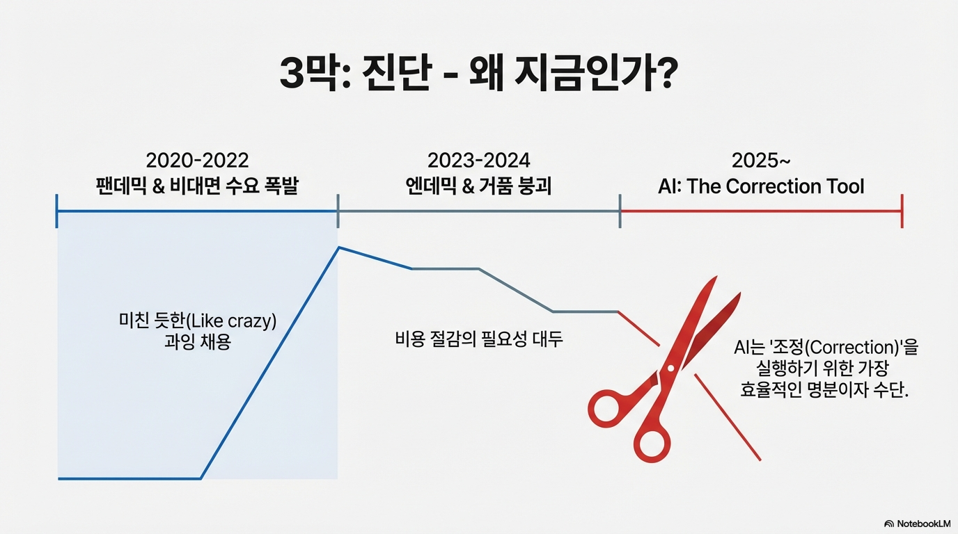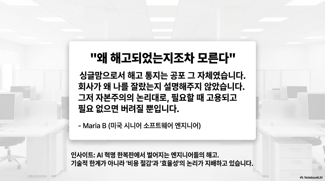 미국의 베테랑 소프트웨어 엔지니어이자 싱글맘인 마리아(Maria)는 자고 일어나 확인한 이메일 한 통에 무너졌습니다. "귀하의 역할이 소멸되었습니다(Your role has been eliminated)." 10년 넘게 기술의 최전선에서 일해온 그녀에게 돌아온 것은 차가운 시스템 메시지뿐이었습니다. 이는 단순한 불운이 아닙니다. 코로나19 시기 온라인 비즈니스의 폭발적 팽창에 대응하기 위해 단행했던 '과잉 고용(Overhiring)'의 거품을 걷어내고, 그 빈자리를 AI로 채우려는 빅테크의 냉혹한 '교정 작업'이 시작된 것입니다.