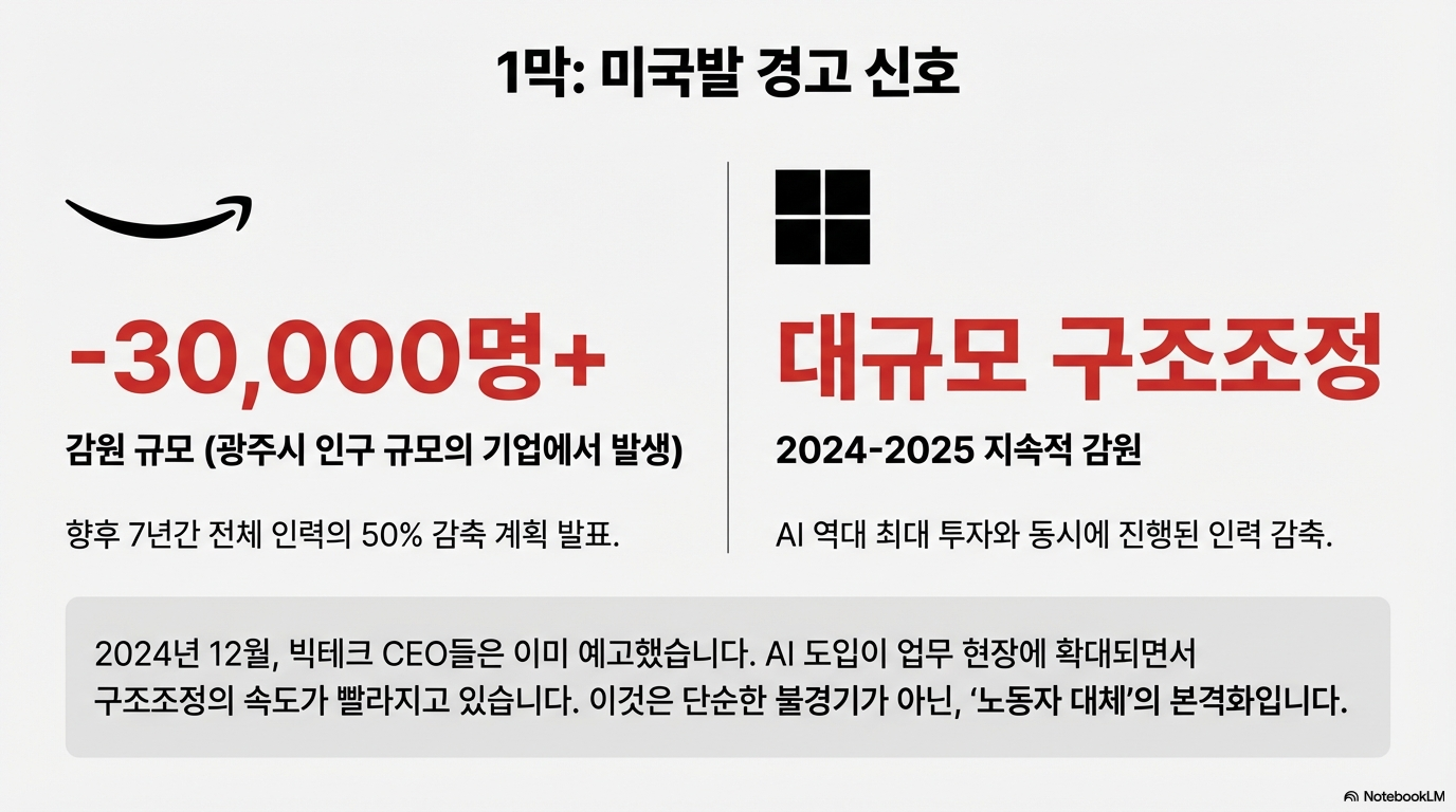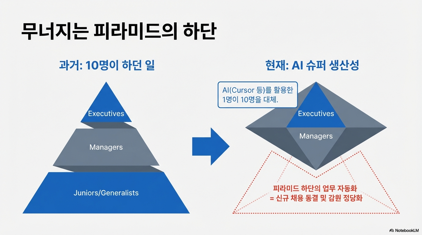 한국은 근로기준법상 대규모 해고가 어렵지만, 기업들은 이미 다른 방식으로 대응하고 있습니다. 지난 연말, 대외적으로 보도되지는 않았으나 국내 주요 기업(엔터프라이즈)의 임원 레벨에서는 이미 한차례 거센 구조조정이 지나갔습니다. 실무진에게는 '재교육(Reskilling)'이라는 이름으로 유예기간을 주면서도, 의사결정권자부터 AI 시대에 맞는 인물로 교체하는 '보이지 않는 숙청'이 일어난 것입니다.