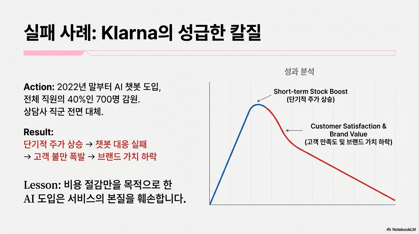 • 클라르나(Klarna)의 패착: 스웨덴 핀테크 기업 클라르나는 5,000명 이상의 직원 중 40%가 넘는 인원을 감축하며 AI 챗봇을 전면에 내세웠습니다. 초기에 주주들은 비용 절감에 환호했지만, 고객 대응의 질이 급격히 떨어지며 브랜드 가치 하락이라는 부메랑을 맞았습니다.