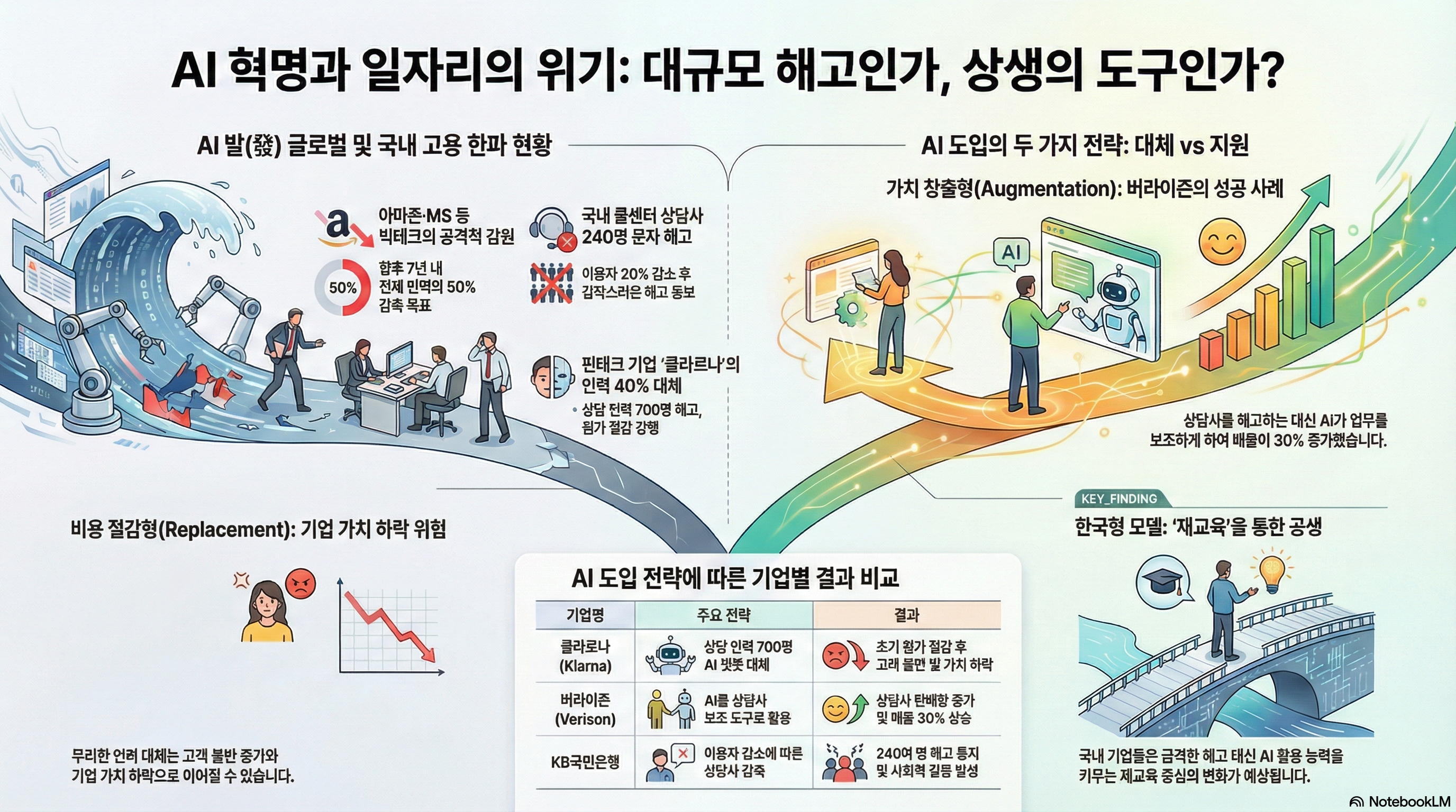 AI 도입이 반드시 기업 가치 하락과 고용 절벽으로 이어지는 것은 아닙니다. 도입의 목적이 '비용 절감'인가 '가치 창출'인가에 따라 결과는 극명하게 갈립니다.
