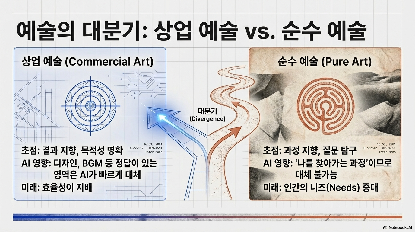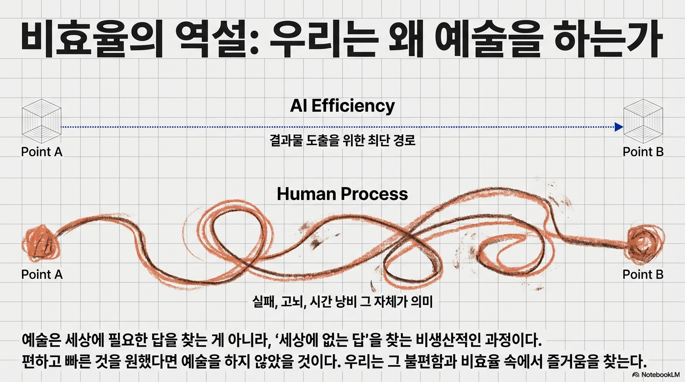 이처럼 섬뜩한 가능성 앞에서, 대화는 기술적 통제가 아닌 지극히 인간적인 가치의 전환으로 향했습니다. AI가 효율성과 생산성을 극대화하는 방향으로 발전할수록, 인류는 역설적으로 그 반대편에 있는 '비효율성'에서 심오한 가치를 재발견하게 될 것이라는 전망입니다. 김대식 교수는 예술의 거대한 분화를 예측합니다. '흥행'이라는 명확한 목표가 있는 '상업 예술'은 AI가 상당 부분 대체하겠지만, 정해진 답 없이 나를 찾아가는 과정 자체를 탐구하는 '순수 예술'에 대한 인간의 갈증은 오히려 폭발적으로 증가할 것이라는 분석입니다. AI 시대에 인간은 결과가 아닌 과정의 가치를 더 중요하게 여기게 될 것입니다. 김혜연 안무가의 말처럼, 예술의 본질은 바로 그 지점에 있습니다.