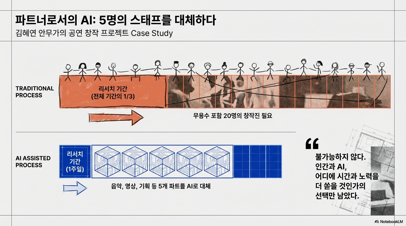 김혜연 안무가는 이것이 미래의 예측이 아님을 분명히 했습니다. 그는 무려 3년 전, 한 작품을 만들 때 함께 일하던 20명의 창작진 중 5명의 역할을 AI로 대체했던 경험을 공유했습니다. 음악, 영상, 기획, 드라마투르그(dramaturg, 연극·무용 작품의 문학적·이론적 조언자)와 같은 역할을 사람이 아닌 AI에게 맡긴 것입니다. 이는 단순히 비용을 절감하는 차원의 문제가 아닙니다. 창작의 과정과 예술가들의 협업 방식 자체가 근본적으로 변하고 있음을 보여주는 중요한 신호입니다.
