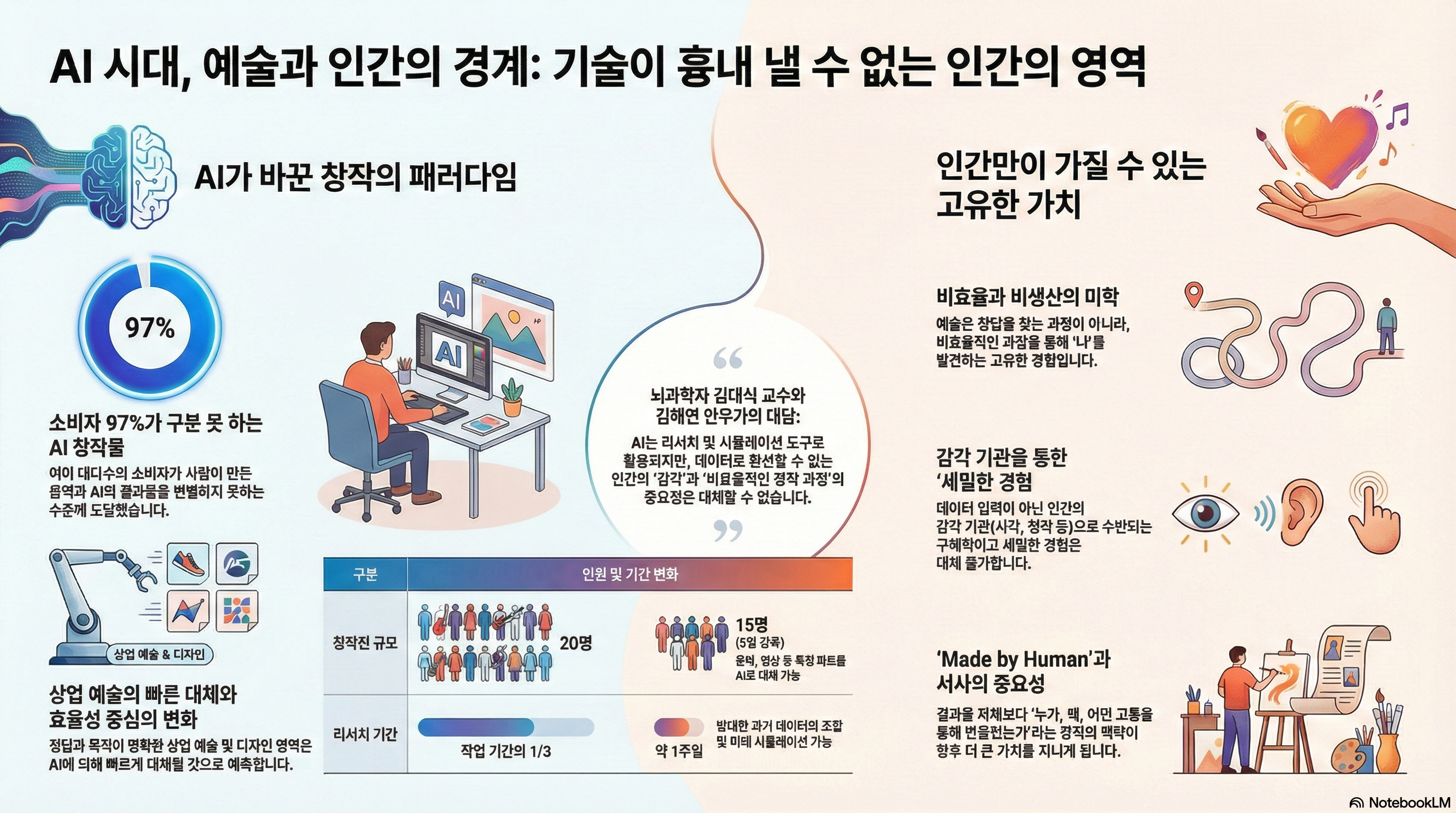 뇌과학자가 내놓는 인공지능에 대한 서늘한 예측이, 이미 AI를 창작의 파트너로 삼은 예술가의 현실과 만날 때 어떤 대화가 펼쳐질까요? 인공지능이 인간 고유의 영역이라 믿었던 창의성과 예술마저 넘보는 지금, 그 답은 우리가 생각했던 것보다 훨씬 더 놀랍고 근원적인 질문으로 우리를 이끕니다.