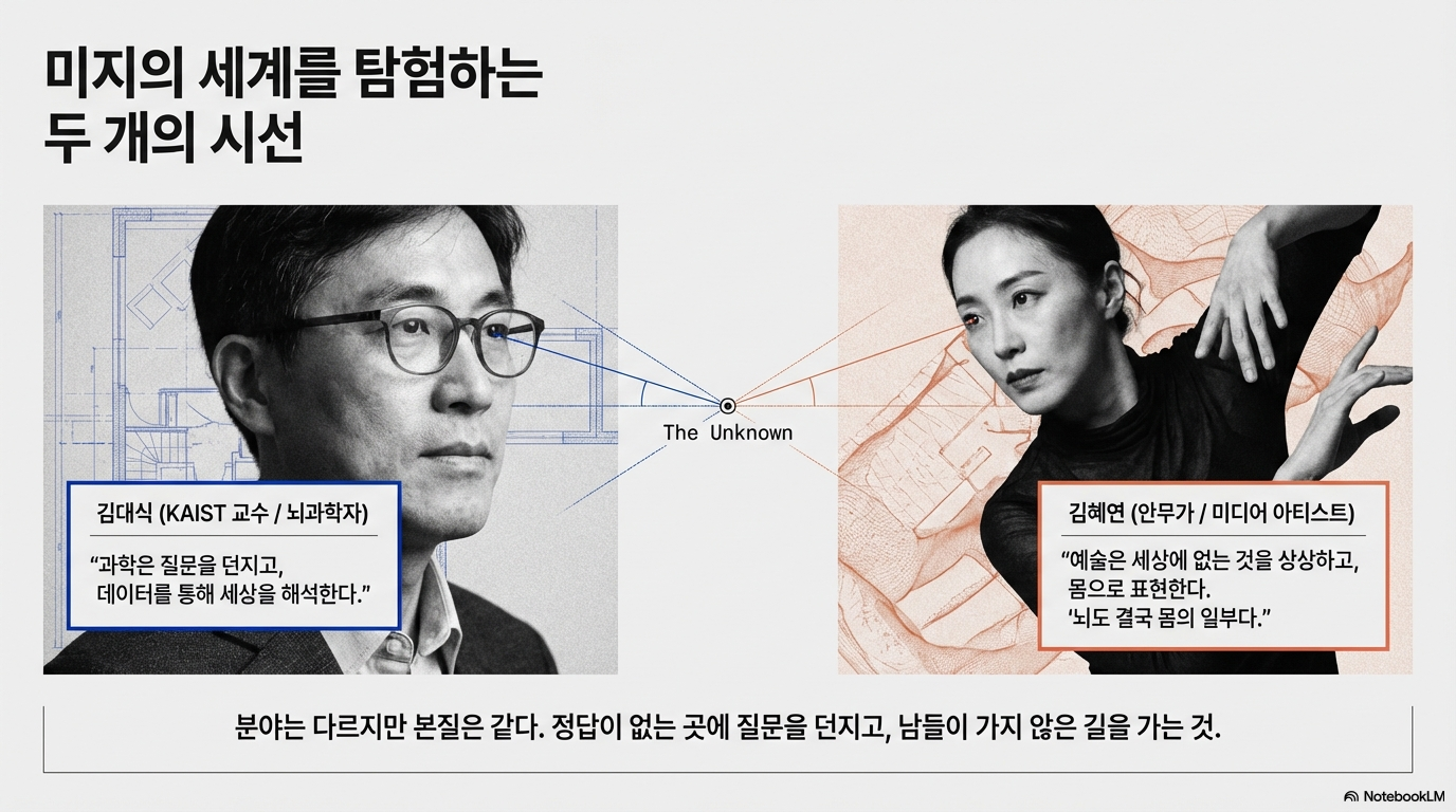 기술의 미래를 예측하는 김대식 교수와 그 기술을 현재로 살아내는 김혜연 안무가의 대화는 단순한 전망을 넘어, AI 시대를 살아갈 우리 모두를 위한 가장 날카로운 통찰을 담고 있었습니다. 기술과 예술의 최전선에서 그들이 발견한 5가지 놀라운 사실을 소개합니다.