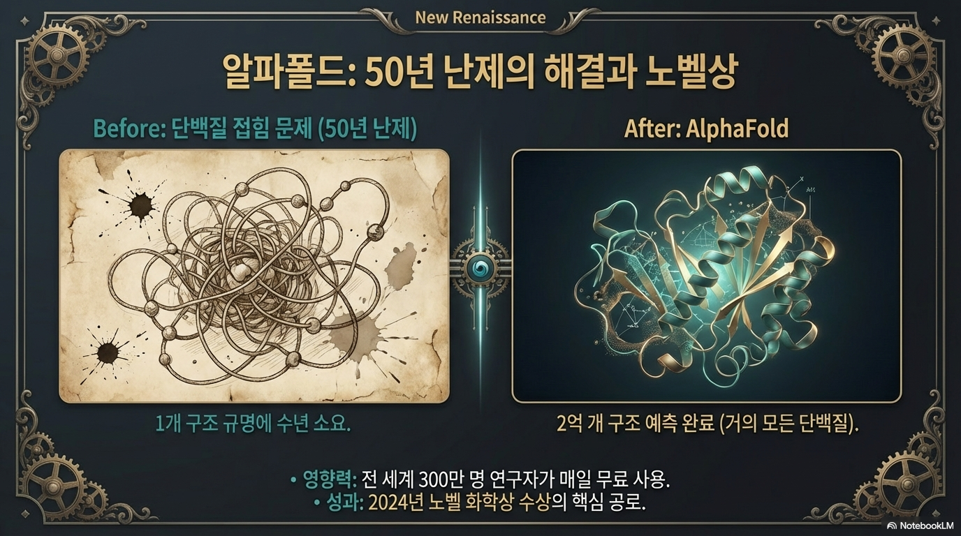 허사비스는 **'알파폴드'**를 통해 과학계에 알려진 2억 개의 모든 단백질 구조를 예측해냈고, 이 방대한 데이터를 전 세계 300만 명의 연구자에게 무료로 공개했습니다. 이러한 공로를 인정받아 그는 2024년 노벨 화학상 수상과 함께 **기사 작위(Knighthood)**를 수여받았습니다. 이는 AI가 기초 과학의 패러다임을 바꿀 수 있음을 보여준 가장 상징적인 사건입니다.