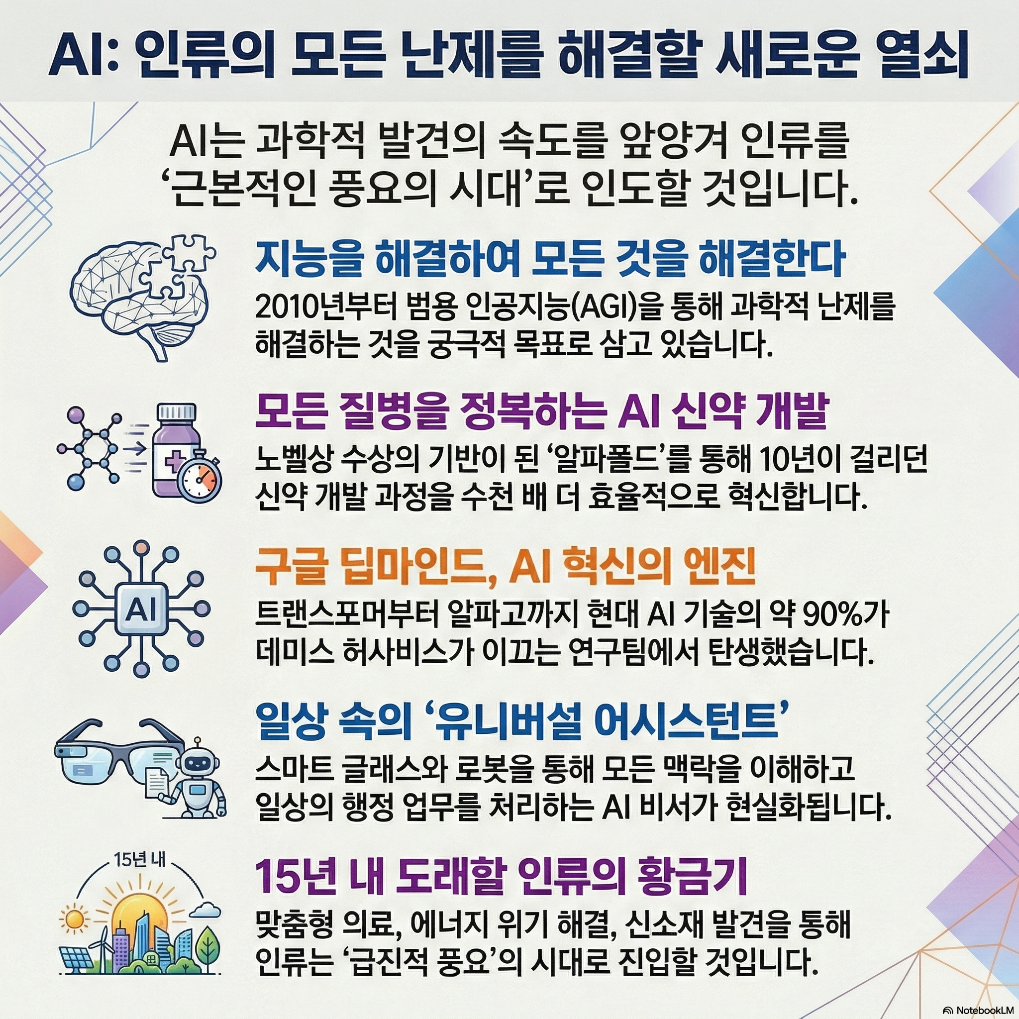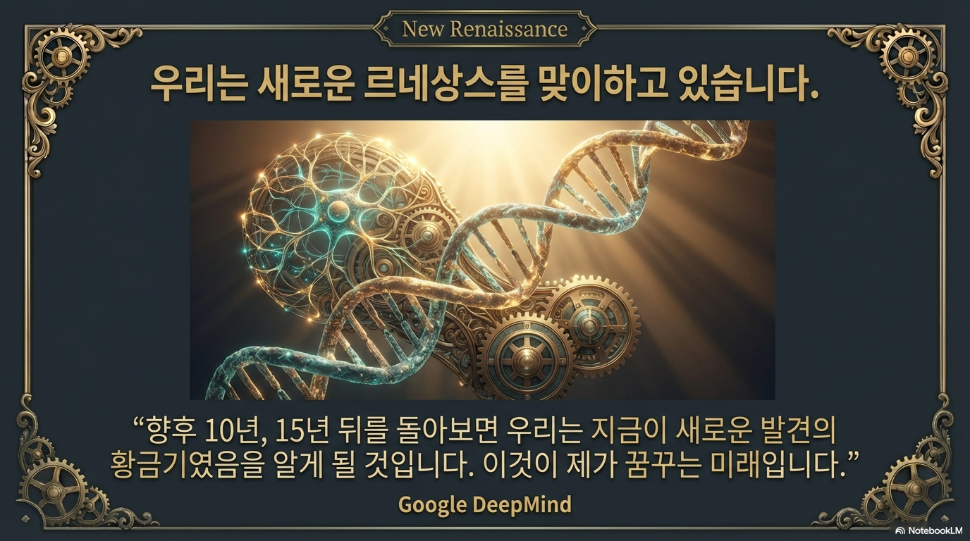인류 역사는 도구의 발명과 함께 진화해 왔습니다. 하지만 우리가 지금 마주한 인공지능(AI)은 단순한 도구를 넘어, 우주의 비밀을 풀기 위한 **'궁극의 망원경'**에 가깝습니다. 구글 딥마인드의 수장 데미스 허사비스는 향후 10~15년 내에 인류가 **'새로운 발견의 황금기(Golden Era of Discovery)'**이자 **'새로운 르네상스'**를 맞이할 것이라고 단언합니다.