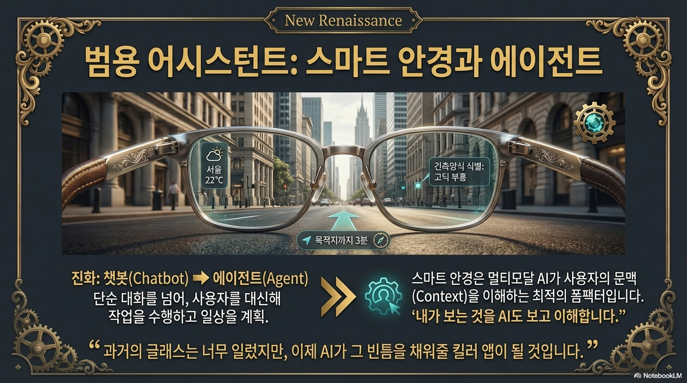 허사비스는 향후 18개월 내에 로봇 공학의 돌파구와 함께, 스마트 안경이 AI의 '킬러 앱'으로 부상할 것이라 예측합니다. 그가 꿈꾸는 미래는 스마트폰이나 자동차, 사무실 등 모든 환경에서 사용자의 맥락을 완벽히 이해하고 끊김 없이 연결되는 **'유니버설 어시스턴트(Universal Assistant)'**가 존재하는 세상입니다.