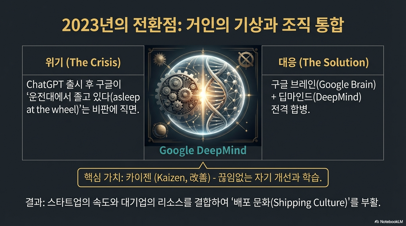 2023년 구글 브레인과 딥마인드의 합병은 구글을 다시금 혁신의 궤도로 올렸습니다. 이제 딥마인드는 구글이라는 거대 기업에 에너지를 공급하는 **'핵심 엔진룸'**이자 '원자력 발전소' 역할을 수행합니다.