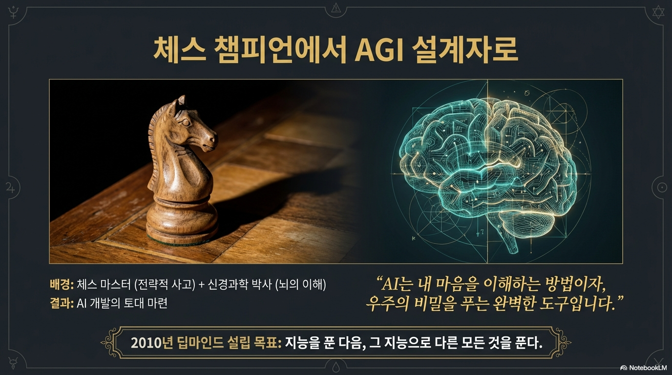 어린 시절 체스 마스터이자 우주론과 물리학에 심취했던 허사비스에게 AI는 비즈니스 모델 그 이상이었습니다. 그는 '생각에 대한 생각(Thinking about thinking)'을 통해 인간 의식의 본질을 이해하고, AI를 과학적 발견의 가속기로 삼아 우주의 거대한 질문들에 답하고자 합니다. 그의 비전은 단순한 챗봇을 넘어, 인류가 직면한 모든 난제를 해결하려는 거대한 지적 탐험에서 시작됩니다.