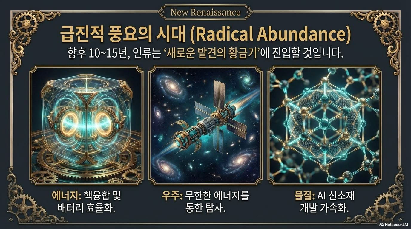 AI는 이제 단순한 업무 보조 도구가 아닙니다. 에너지 문제를 해결하고, 질병을 정복하며, 인류가 은하계를 탐험할 수 있게 돕는 **'급진적 풍요(Radical Abundance)'**의 열쇠입니다.