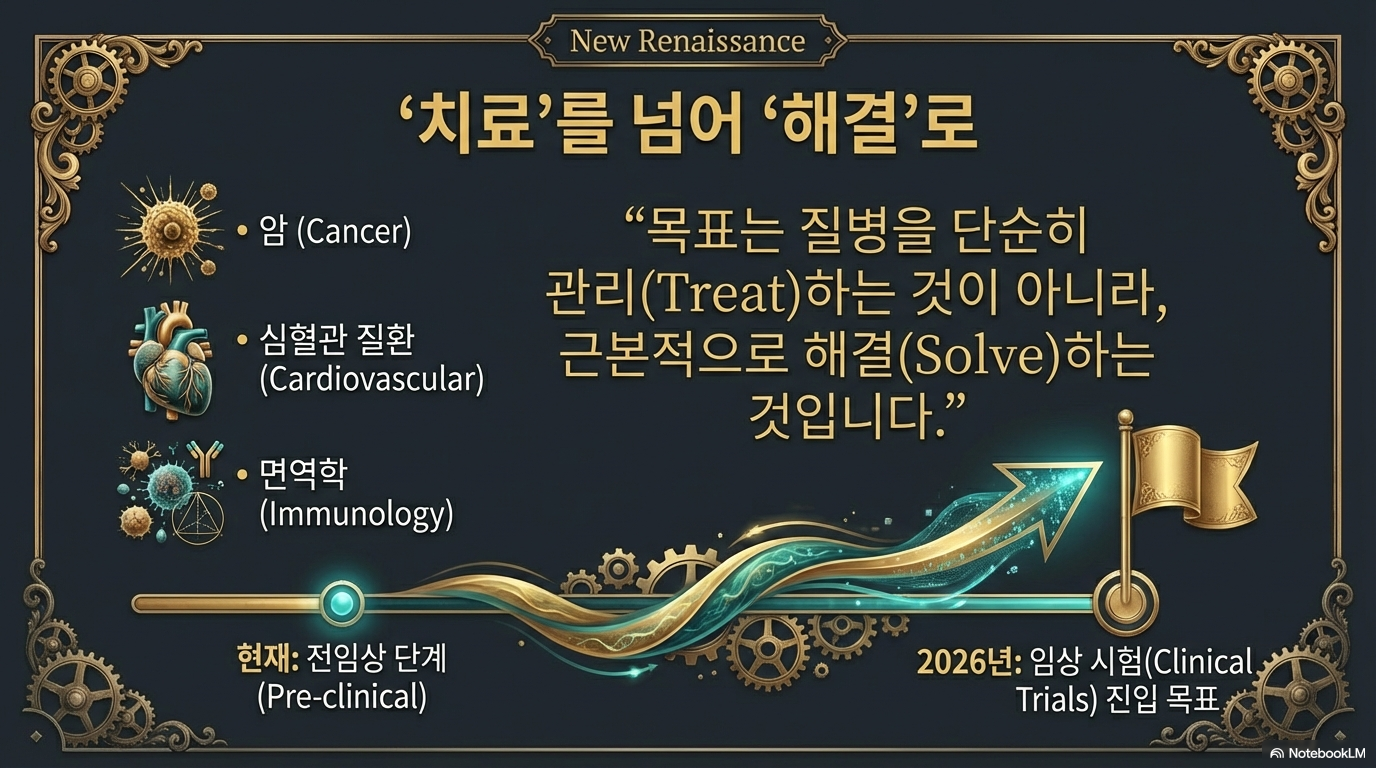 허사비스는 알파폴드의 성공을 실제 인류의 건강으로 치환하기 위해 스타트업 **'아이소모픽(Isomorphic Labs)'**을 이끌고 있습니다. 그는 질병을 단순히 증상 완화 차원에서 '치료(Cure)'하는 것이 아니라, 공학적으로 '해결(Solve)'하고자 합니다.