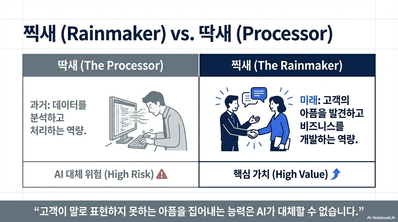 회계 업계에는 소위 '찍세(영업/BD)'와 '딱세(실무)'라는 비유가 있습니다. AI 시대의 회계사는 이제 궁극의 실무자인 AI를 거느린 '최고의 영업가(Catcher)'가 되어야 합니다. 여기서 영업이란 단순히 일감을 따오는 것이 아니라, 고객이 말로 표현하지 못하는 고통(Pain Point)을 포착하고 '문제 정의'를 내리는 창조적인 영역을 의미합니다.