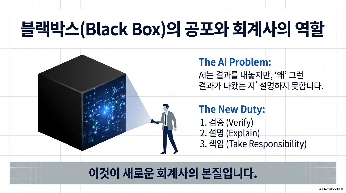 AI 도입은 회계사에게 'AI 알고리즘 감사'라는 거대한 신규 시장을 열어주었습니다. AI의 가장 큰 약점은 결과 도출 과정이 불투명한 '블랙박스(Black Box)' 문제와 할루시네이션(환각) 리스크입니다. 기업이 AI의 분석 결과를 믿고 수조 원의 의사결정을 내리기 위해서는 그 알고리즘의 공정성과 신뢰성을 누군가 보증해야 합니다.