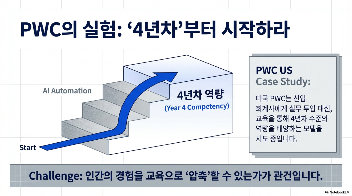 전통적인 회계 업계는 주니어가 단순 업무를 수행하며 선배의 판단력을 어깨너머로 배우는 도제식 '피라미드 구조'에 기반해 왔습니다. 하지만 AI가 주니어의 '손발' 역할을 대신하면서 이 성장판이 닫힐 위기에 처했습니다. 미국의 PWC 같은 글로벌 펌들은 이제 1~2년 차에게 곧바로 4년 차 수준의 '판단 및 해석' 업무를 가르치는 파격적인 교육 패러다임 전환을 시도하고 있습니다.