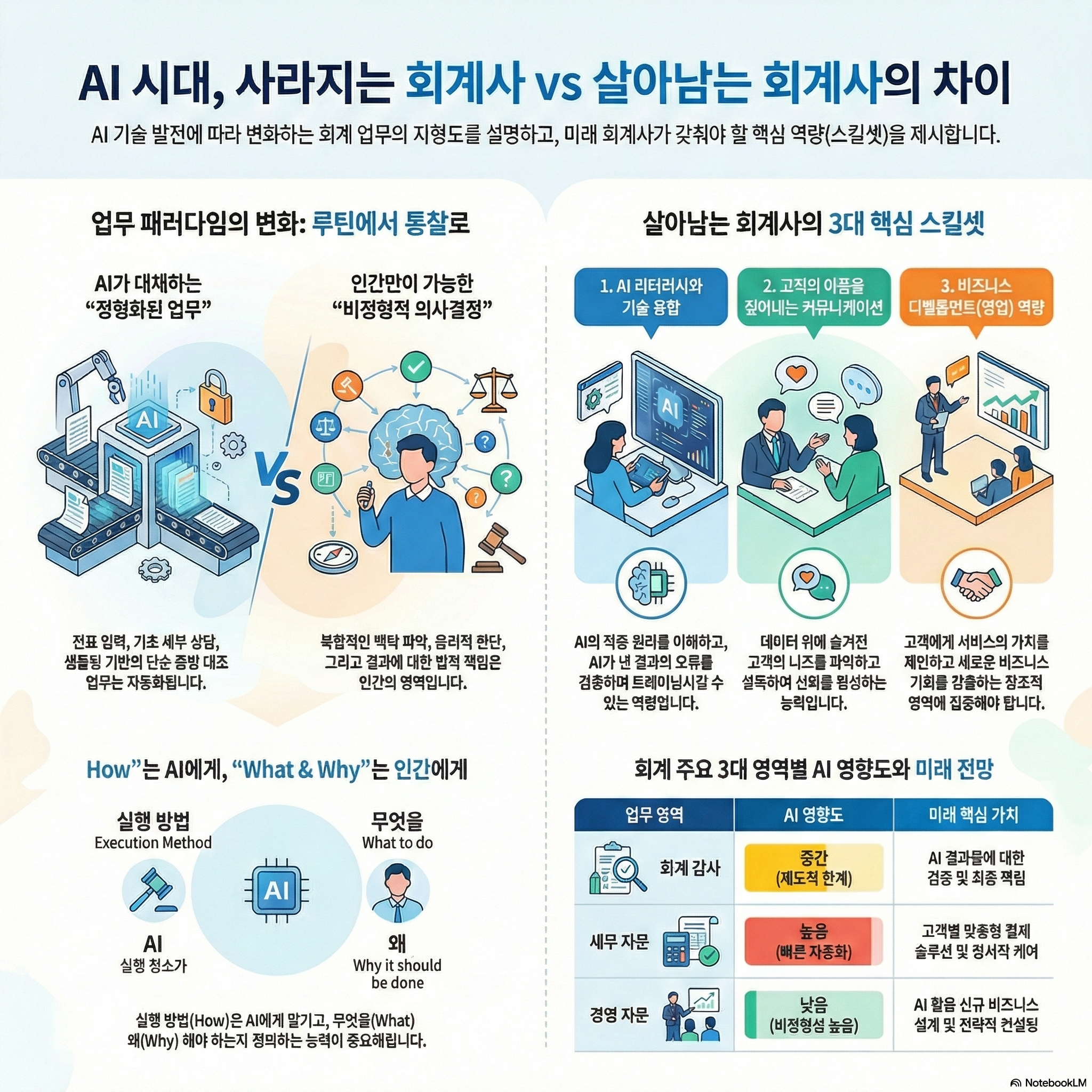 AI가 정답을 찾는 '딱세' 역할에서 타의 추종을 불허한다면, 인간 회계사는 고객에게 정서적 케어를 제공하고 "당신에게 필요한 것은 이것입니다"라고 가치를 제안하는 '찍세'의 영역에서 승부를 봐야 합니다.