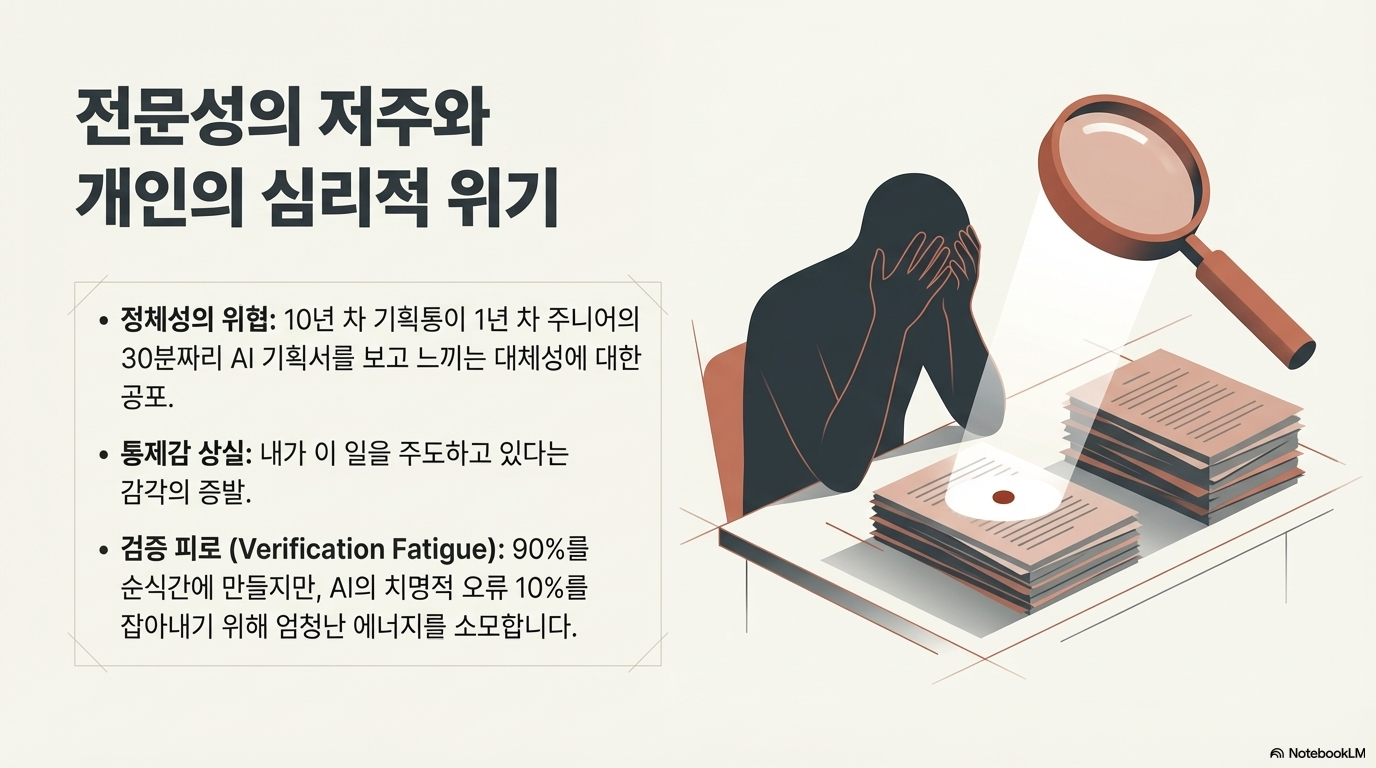 10년 동안 기획 통으로 불리던 베테랑은 1년 차 신입이 AI로 30분 만에 뽑아온 고퀄리티 기획안을 보며 밤잠을 설치기도 합니다. 자신이 평생 쌓아온 전문성이 대체될 수 있다는 공포는 AI 활용에 대한 심리적 저항으로 이어지며, 이는 팀 내 미묘한 불신의 씨앗이 됩니다.
