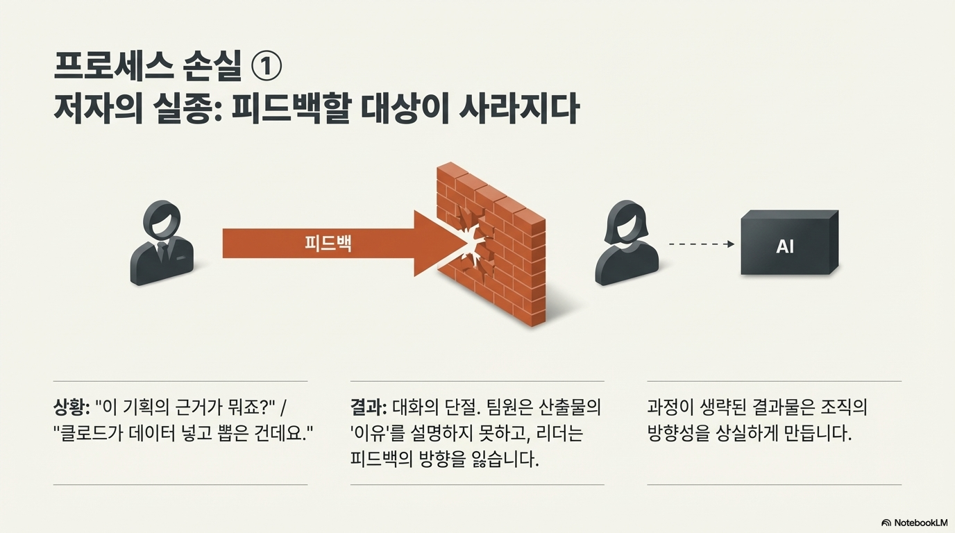 '잠재 성과'는 팀원 개개인이 낼 수 있는 최대 역량의 합입니다. AI는 개인이 PM, 분석가, 개발자의 역할을 동시에 수행하게 함으로써 이 잠재 성과를 비약적으로 높여놓았습니다. 하지만 문제는 '프로세스 손실' 역시 그만큼 커졌다는 점입니다. 소스 컨텍스트에 따르면, AI 도입 이후 팀 내에서는 세 가지 형태의 손실이 두드러집니다.