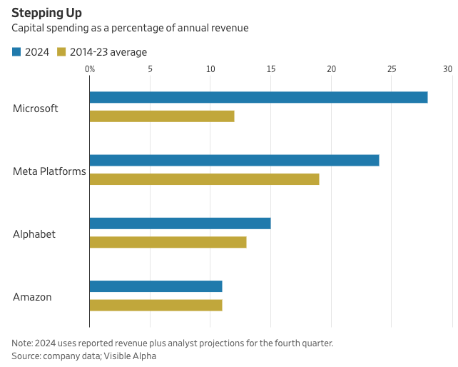 Microsoft와 Meta는 모두 AI 기술을 위한 인프라와 시스템을 구축하기 위해 상당한 자본 지출을 하고 있습니다. Microsoft는 올해에만 약 530억 달러를 투자했으며, 이는 자사 매출의 약 28%에 달합니다. 이 비율은 과거 2014년부터 2023년까지 평균적으로 매출의 12%를 자본 지출에 할애했던 것에 비하면 두 배 이상 높은 수준입니다. Meta 또한 올해 약 380억에서 400억 달러를 AI에 투자할 계획이며, 이는 연 매출 대비 약 24%에 해당합니다.