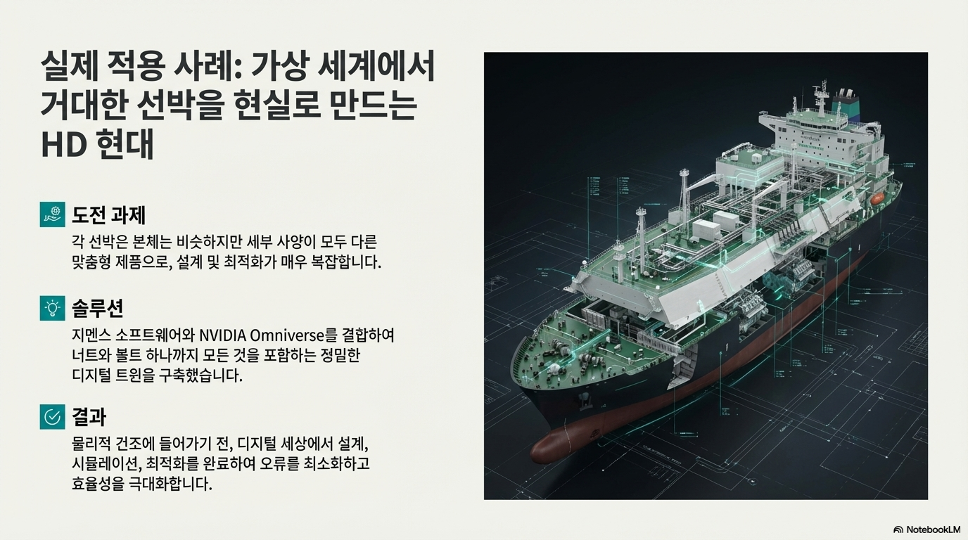첫째, HD현대는 거대한 선박의 "모든 너트와 볼트"까지 포함된 완벽한 디지털 트윈을 구축합니다. 그리고 실제 건조에 들어가기 전에 가상의 바다에서 선박의 운항을 시뮬레이션하며 모든 문제점을 미리 파악하고 최적화합니다.