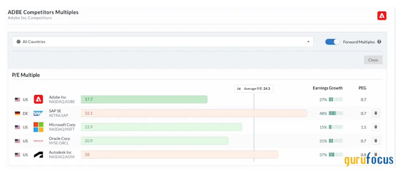 현재 어도비의 선행 주가수익비율(P/E)은 17.7배로, 소프트웨어 업계 평균인 24.2배보다 낮게 평가되고 있습니다. 이는 마이크로소프트(22.9배), 오라클(20.9배), 오토데스크(28배), SAP(32.1배)와 비교해도 상당히 저평가된 수준입니다.