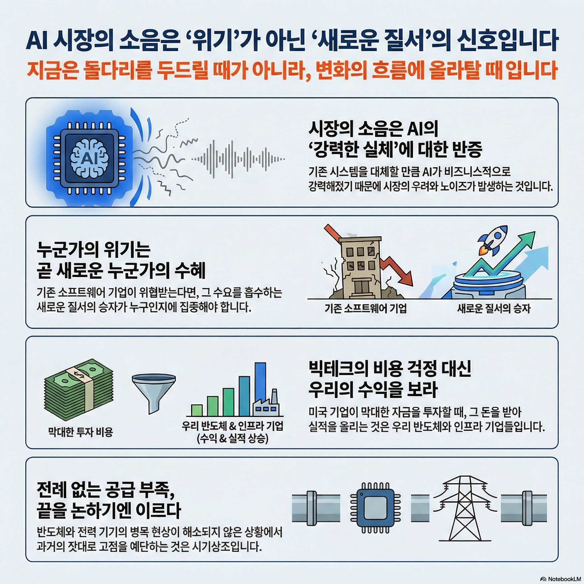 시장에는 늘 노이즈가 존재합니다. 하지만 그 안개 속에 숨겨진 본질은 **'AI가 강력한 비즈니스 모델로서 새로운 질서를 만들어내고 있다'**는 점입니다. 자극적인 기사 제목에 흔들려 막연한 공포에 빠지기보다, 실제 수익이 어디로 흘러가고 있는지, 누가 실질적인 수혜를 입고 있는지를 냉정하게 따져보아야 합니다.