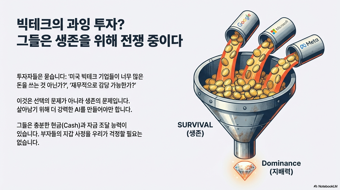 투자자들이 가장 많이 하는 실수 중 하나가 바로 투자를 주도하는 미국 빅테크 기업들의 비용 부담을 대신 걱정하는 것입니다. 하지만 우리는 철저히 '공급자'의 관점에서 이 상황을 바라봐야 합니다.