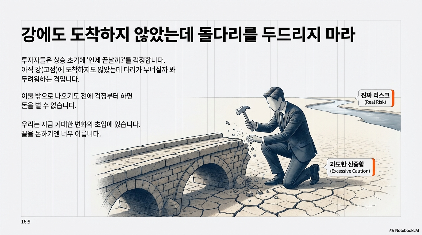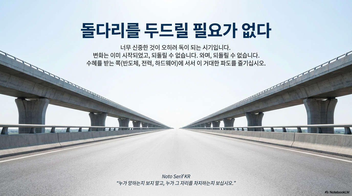 흔히 '돌다리도 두드려보고 건너라'고 하지만, 현재의 AI 시장은 아직 그 다리를 만날 강가에 도착하지도 않은 상태입니다. 즉, 성장이 꺾일 단계를 걱정하기에는 시기상조라는 뜻입니다.