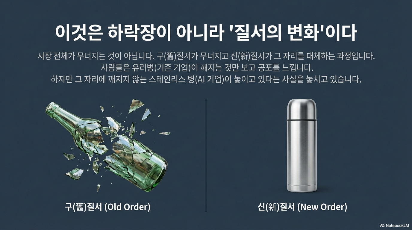 지금도 마찬가지입니다. 누군가의 위기는 필연적으로 다른 누군가의 거대한 수혜로 이어집니다. 투자자는 깨진 유리 조각(도태되는 레거시 소프트웨어/SaaS 기업)이 내는 날카로운 소리에만 집착해서는 안 됩니다. 그 옆에서 새롭게 만들어지는 **'스테인리스 병'이나 '플라스틱 병' 같은 신규 강자(AI 인프라 및 신규 모델 기업)**를 봐야 합니다. 수요는 사라지는 것이 아니라, 구체제에서 신체제로 이동하고 있을 뿐입니다.