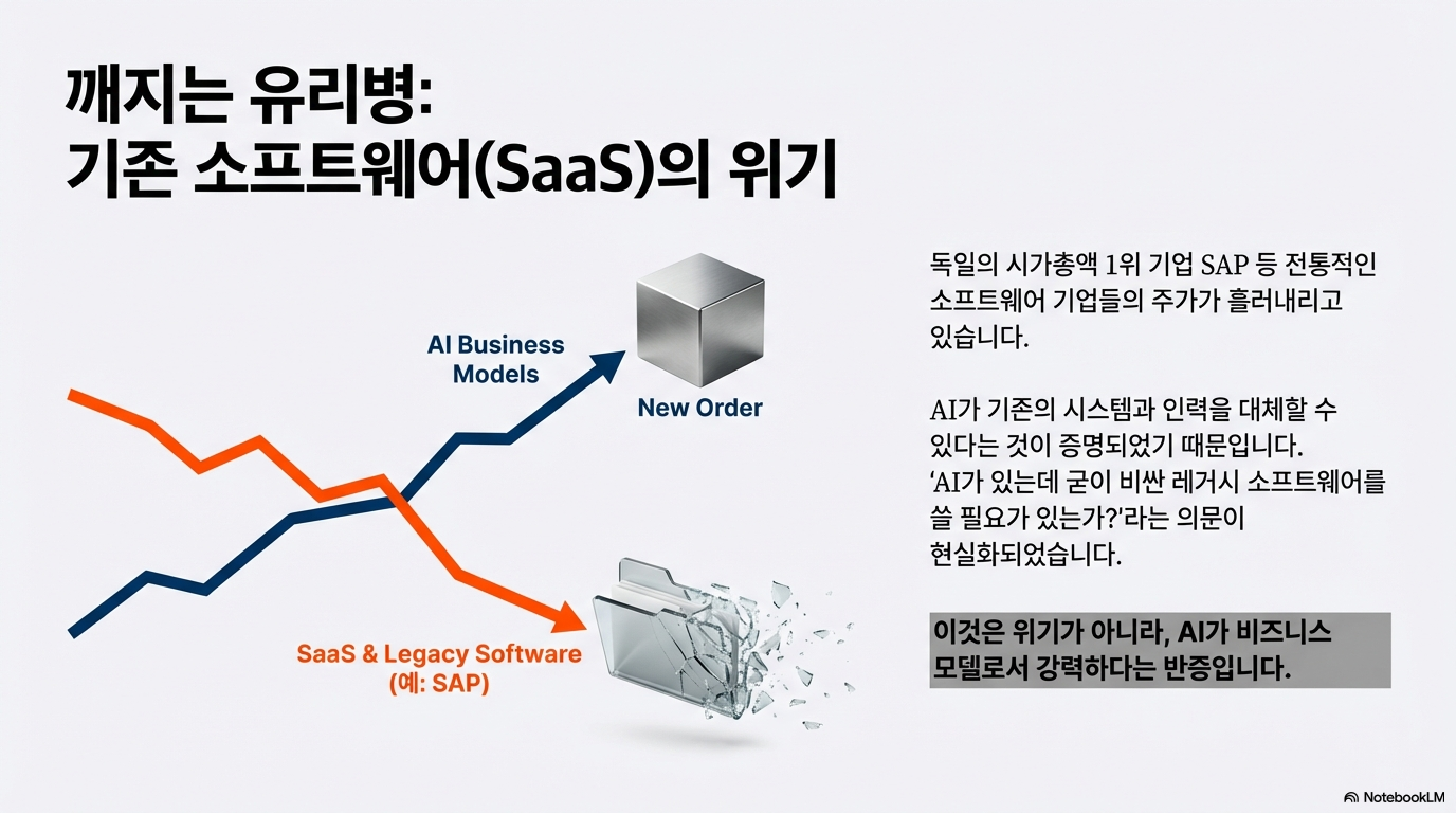 실제 사례를 보십시오. 독일 시가총액 1위인 SAP와 같은 전통적인 SaaS(소프트웨어 서비스) 기업들의 주가는 최근 한 달 내내 하락세를 보였습니다. '클로드(Claude)'와 같은 강력한 AI 모델이 등장하면서, 굳이 기존의 비싼 인사 관리 시스템이나 소프트웨어를 쓸 필요가 있느냐는 의구심이 현실화된 것입니다. 이는 AI가 드디어 실질적인 수익 구조를 갖춘 비즈니스 모델로서 작동하기 시작했다는 강력한 증거입니다.