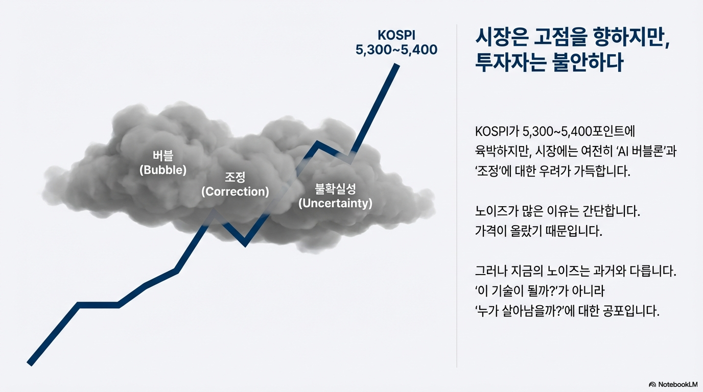 최근 코스피가 5,400선을 넘나드는 유례없는 강세를 보이면서, 투자자들의 마음속에는 기대보다 '막연한 불안감'이 더 크게 자리 잡고 있습니다. "너무 많이 오른 것 아닌가?", "지금이라도 팔아야 하는 것 아닐까?"라는 고민은 'AI 거품론'이라는 자극적인 뉴스들과 맞물려 투자자의 눈을 가립니다.