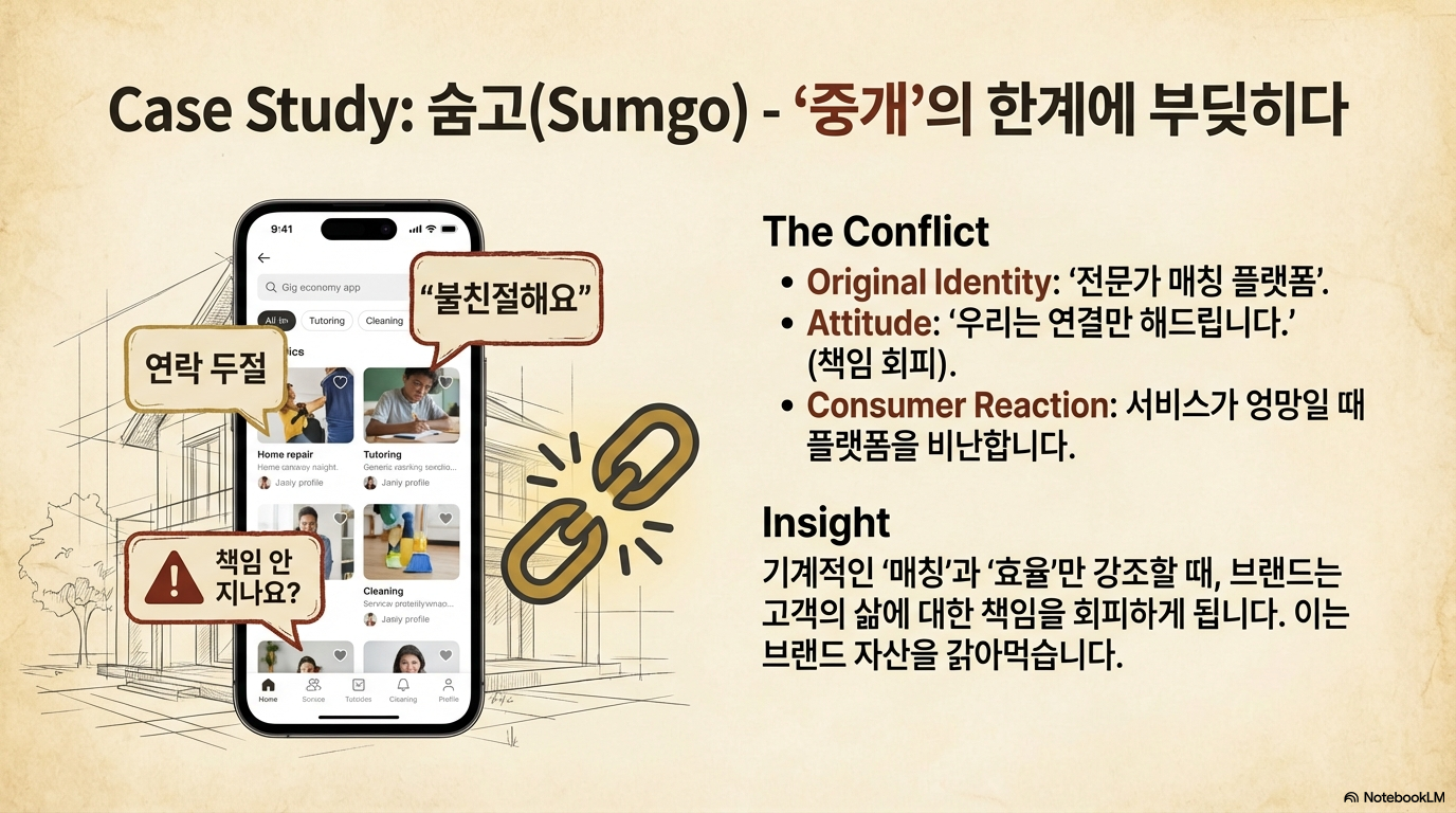 이러한 관점의 전환은 비즈니스 모델을 ‘중개업(brokerage)’에서 ‘역량 산업(competency industry)’으로 바꾸었습니다. 숨고는 더 이상 연결만 하는 회사가 아니라, 고수의 역량과 서비스 품질을 보증하는 회사가 된 것입니다. AI는 효율적인 연결을 수행할 수 있지만, 이처럼 ‘돌봄의 범위를 설계’하고 그에 따른 책임을 지는 것은 인간 고유의 역할입니다.