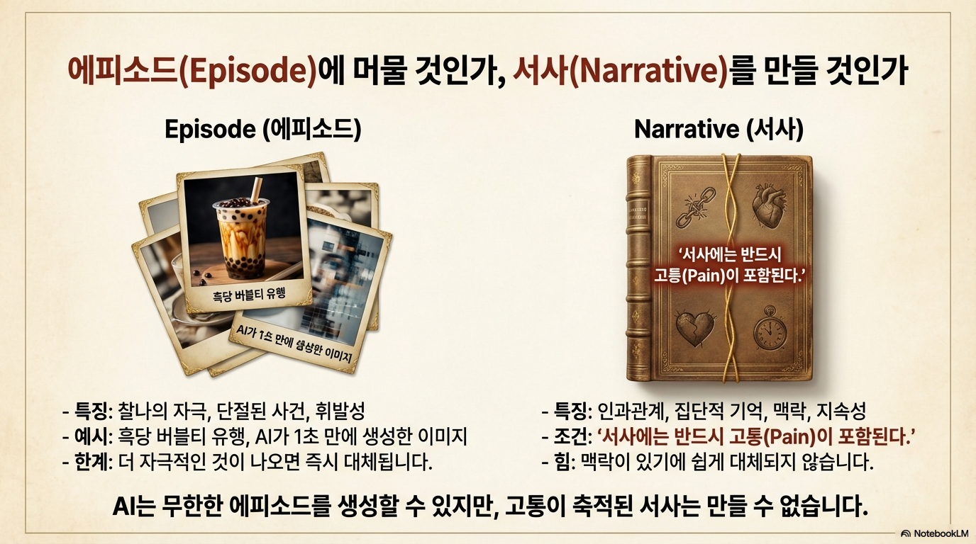 AI가 프롬프트 몇 줄로 만들어내는 자극적이고 유행에 민감한 결과물을 ‘에피소드’라고 할 수 있습니다. 2019년 선풍적인 인기를 끌었던 흑당 버블티처럼, 에피소드는 더 자극적인 다음 에피소드가 나타나면 쉽게 잊힙니다.