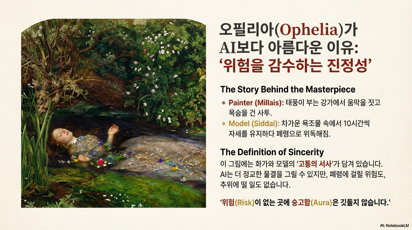 AI는 프롬프트 입력만으로 이와 유사한 이미지를 순식간에 그려낼 수 있습니다. 하지만 그 그림에는 화가와 모델이 겪었던 혹독한 고통의 이야기가 없습니다. 모델 엘리자베스 시달은 6개월에 걸친 작업 기간 동안 차가운 물이 담긴 욕조에서 포즈를 취하다 심각한 저체온증과 폐렴을 앓아야 했습니다. 화가 밀레이는 얼어붙은 강가에 천막을 치고 태풍과 사투를 벌이며 그림을 완성했습니다. 그 살을 에는 추위와 집념의 시간이 그림에 영혼을 불어넣은 것입니다.