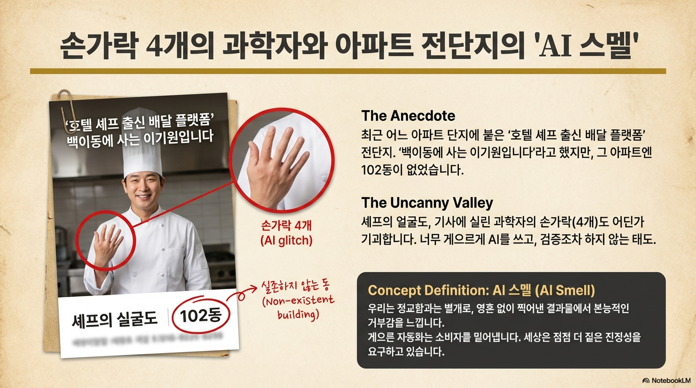 이처럼 AI가 만든 결과물에서 느껴지는 어색하고 진정성 없는 느낌을 ‘AI 스멜’이라고 부릅니다. 기술적으로 완벽해 보일지라도, 우리는 본능적으로 그 안의 공허함을 감지합니다.