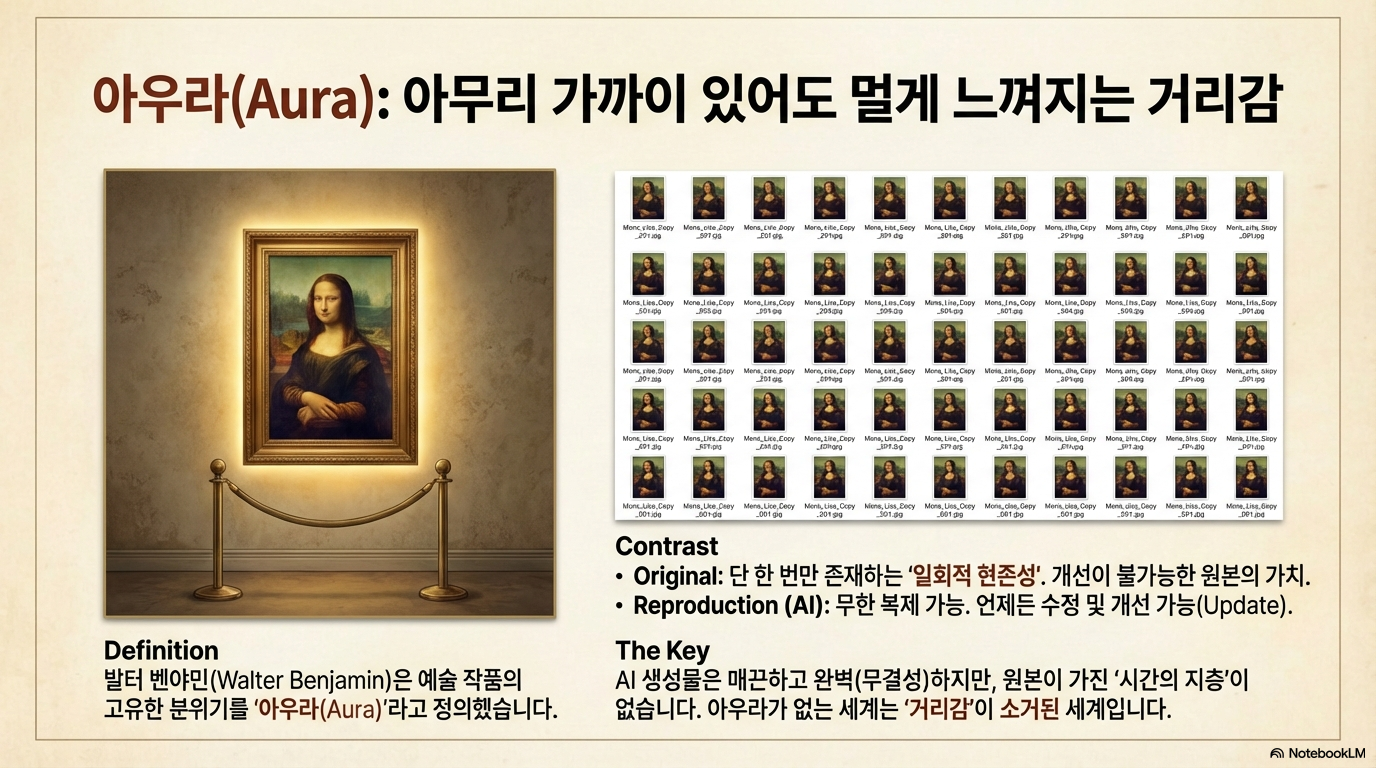 이와 정반대의 개념에 발터 벤야민이 말한 ‘아우라(Aura)’가 있습니다. 벤야민은 아우라를 “아무리 가까이 있더라도 멀리 떨어져 있는 어떤 것의 현존성”, 즉 복제 불가능한 ‘일회적 존재감’이라고 정의했습니다. 쉽게 말해, 복제된 파일이 아닌 루브르 박물관의 ‘모나리자’ 원본 앞에서만 느낄 수 있는, 시간과 역사가 빚어낸 단 한 번의 존재감입니다.