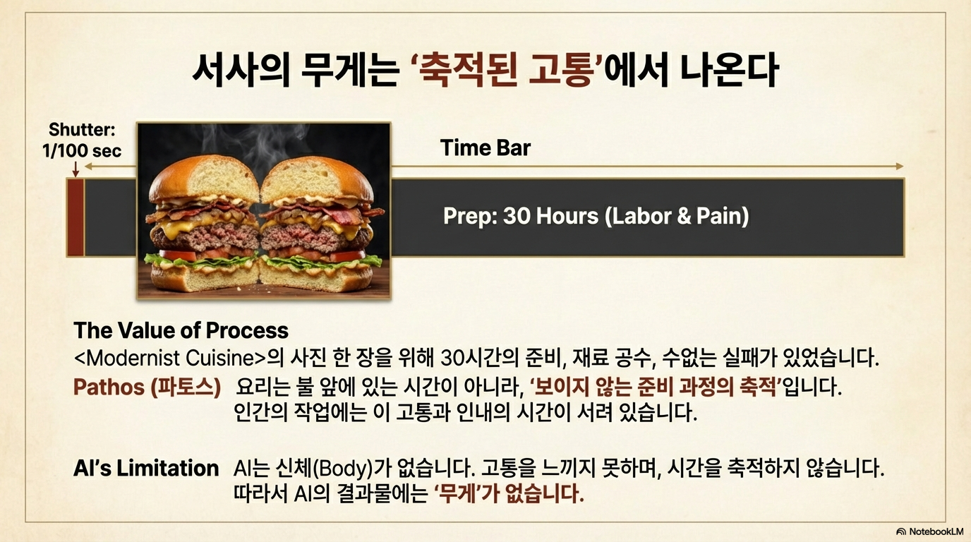 AI와 인간 작업의 근본적인 차이는 바로 이 지점에 있습니다. AI의 작업에는 시간과 고통이 들어가지 않습니다. 오류는 즉시 수정되고 결함은 업데이트를 통해 사라집니다. 그러나 인간의 작업에는 고뇌의 시간이 축적되고 실패의 경험이 새겨집니다. 바로 그 고통의 축적이 아우라를 만듭니다.