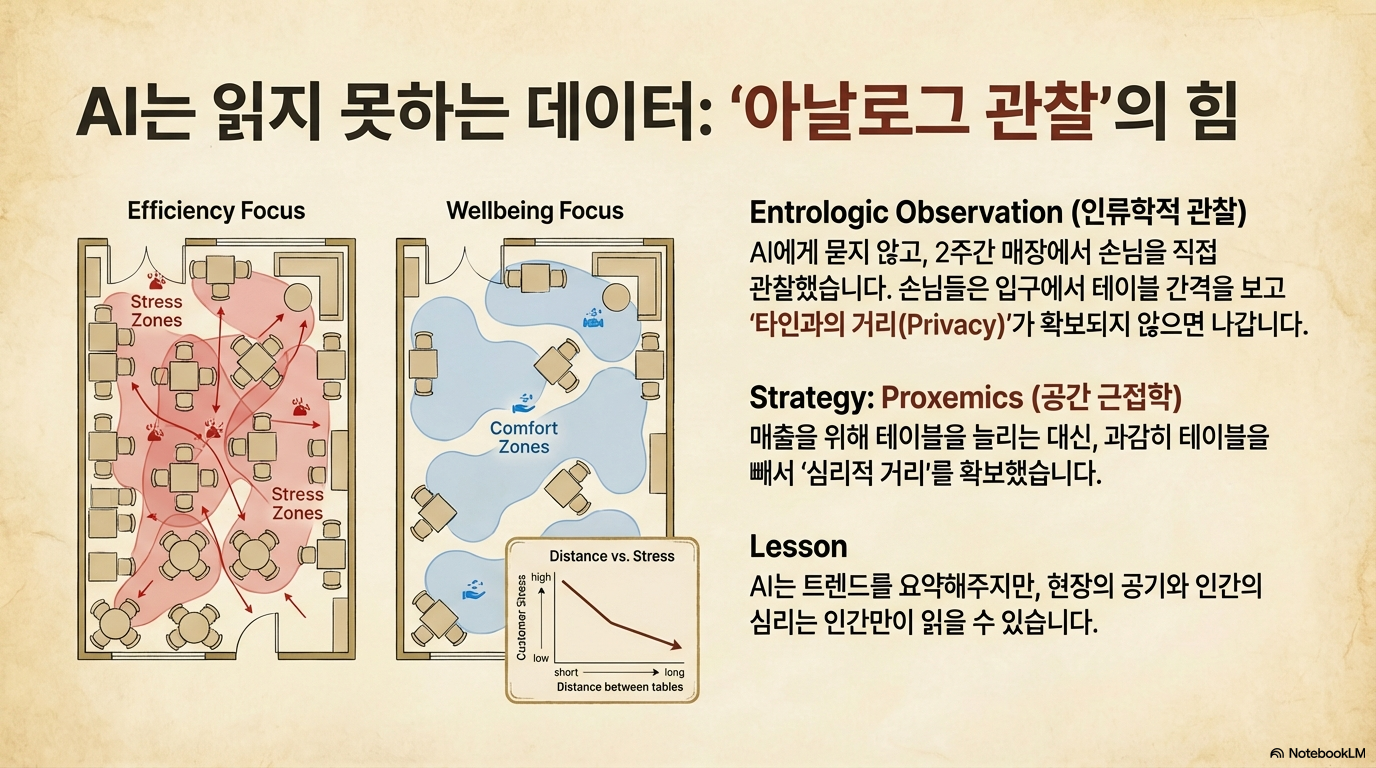 데이터로는 잡히지 않는 인간의 행동이 보이기 시작했습니다. 손님들은 입구에 서서 테이블이 빽빽하게 찬 모습을 보고는 그냥 나가버리는 경우가 많았습니다. 매출을 높이기 위해 테이블을 더 놓아야 한다는 일반적인 생각과 정반대의 현상이었습니다. 이 관찰을 통해 그는 ‘오히려 테이블을 빼자’는 과감한 가설을 세웠고, 타인과의 거리가 가까워질수록 스트레스가 높아진다는 ‘공간 근접학(Proxemics)’ 이론으로 가설을 뒷받침했습니다.