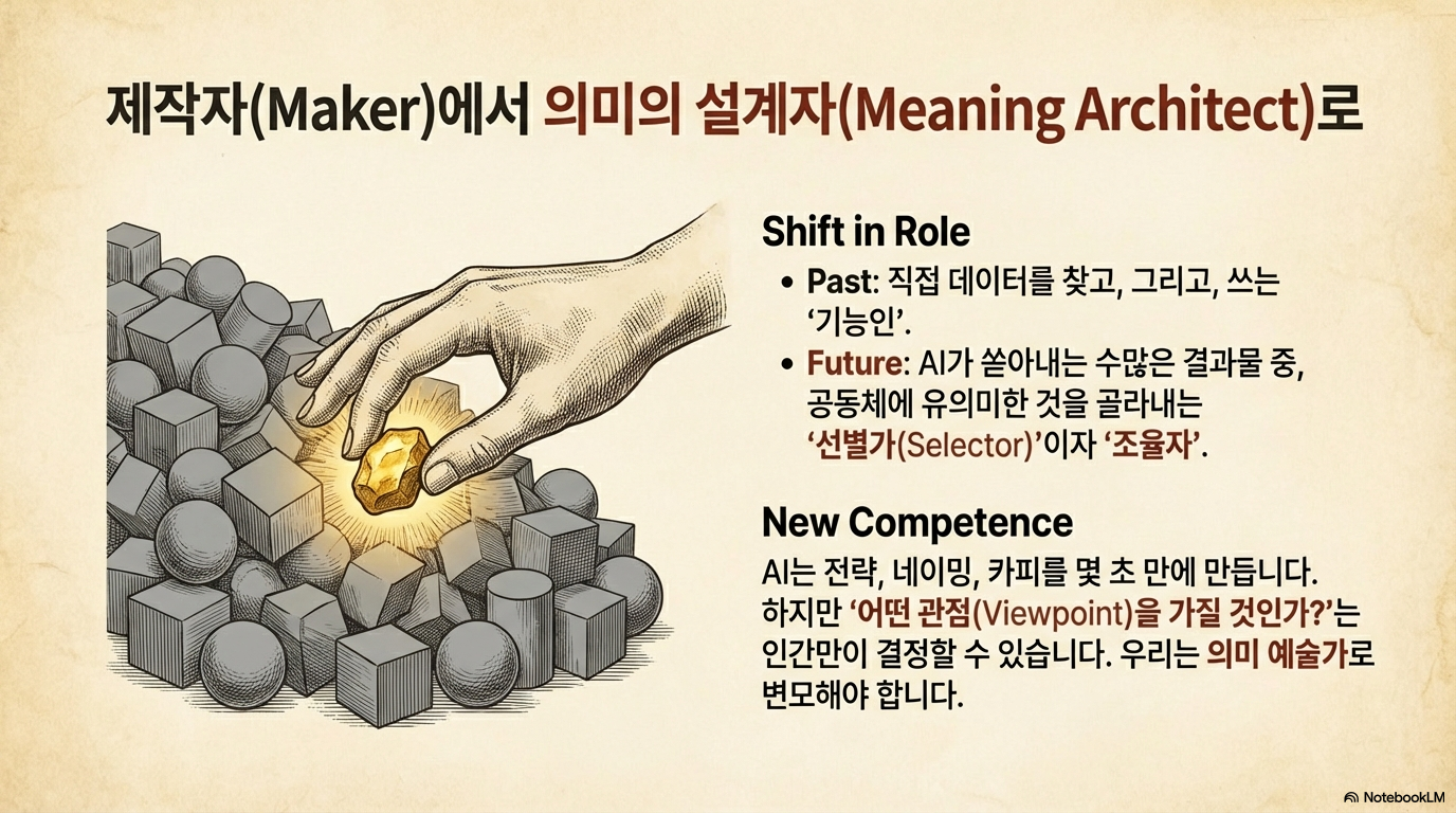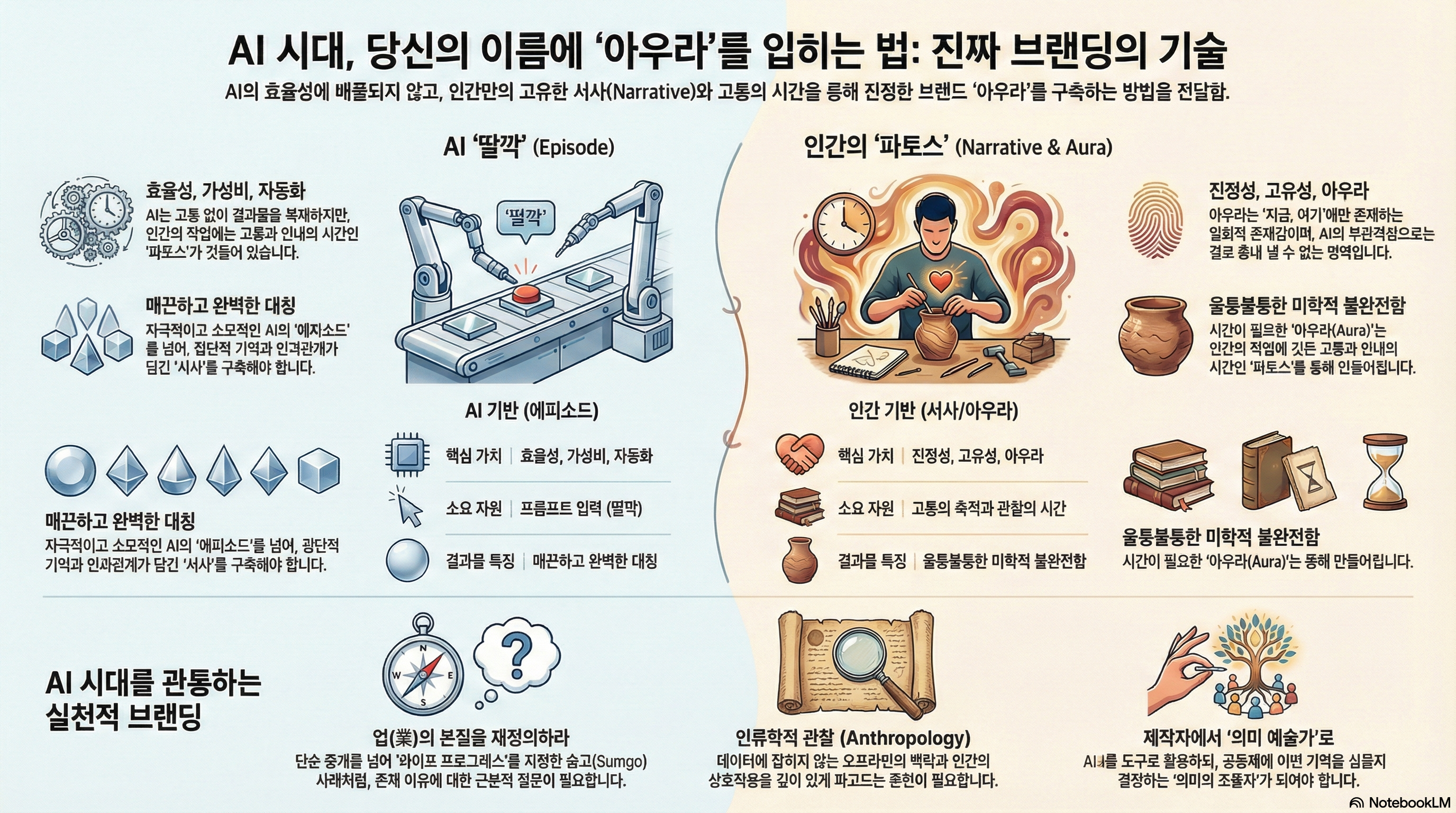 결국 AI 시대에 우리를 차별화하는 것은 기술이 아닌 가장 인간적인 태도입니다. 데이터 너머를 꿰뚫는 깊이 있는 관찰을 통해 고유한 아우라를 만들고, 단순한 연결을 넘어선 책임감으로 업의 본질을 세우며, 비효율적으로 보일지라도 기꺼이 고통의 서사를 쌓아나가는 것. 이것이 바로 대체 불가능한 가치를 만드는 유일한 길입니다.