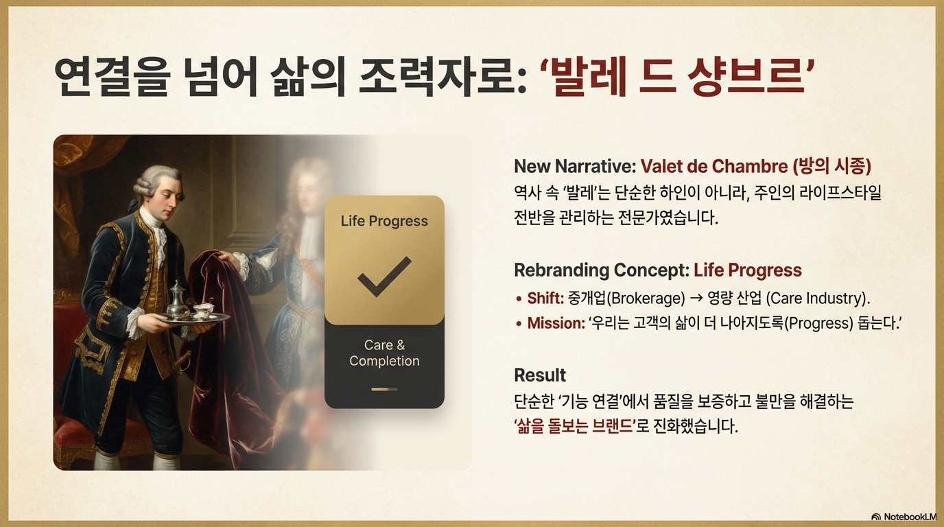 이때 던져진 질문이 바로 “사람들의 삶을 어디까지 책임질 겁니까?”였습니다. 이 질문은 숨고가 업의 본질을 다시 생각하게 만든 전환점이었습니다. 그들은 단순 중개업을 넘어, 고객의 더 나은 삶을 돕는 존재로 스스로를 재정의했습니다. 그 결과 ‘종합 라이프서비스 플랫폼’이자, 주인의 모든 삶을 케어하던 ‘21세기형 발레 드 샹브르(valet de chambre)’라는 새로운 정체성을 찾게 됩니다.