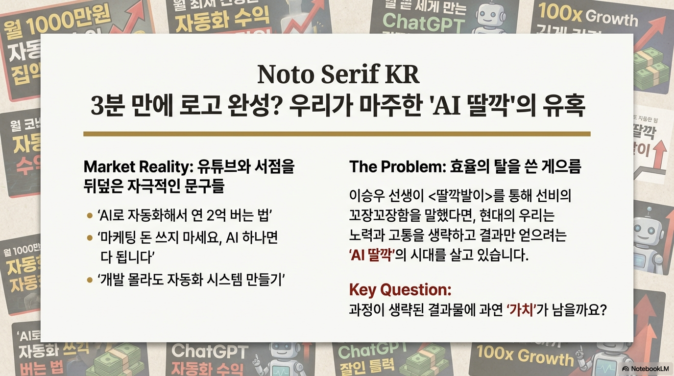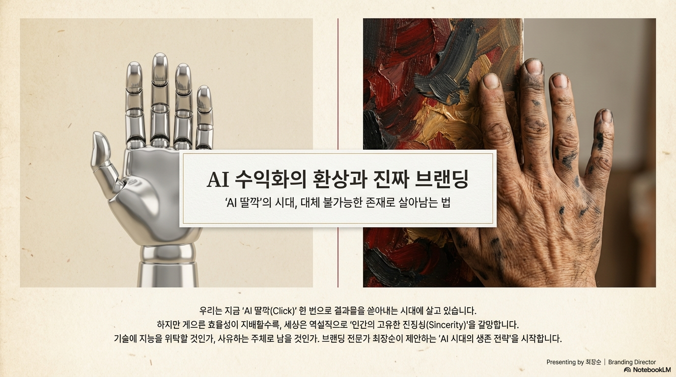 이는 우리에게 근본적인 질문을 던집니다. “클릭 몇 번으로 만들어진 결과물에 과연 진정한 가치가 있을까?” 이 거대한 질문에, 브랜드 전략가 최장순 대표는 하나의 강력한 해독제를 제시합니다. AI의 압도적인 효율성에 맞서, 대체 불가능한 가치를 만드는 그의 통찰은 의외의 지점에서 시작됩니다. 바로 자신의 이름이었습니다.