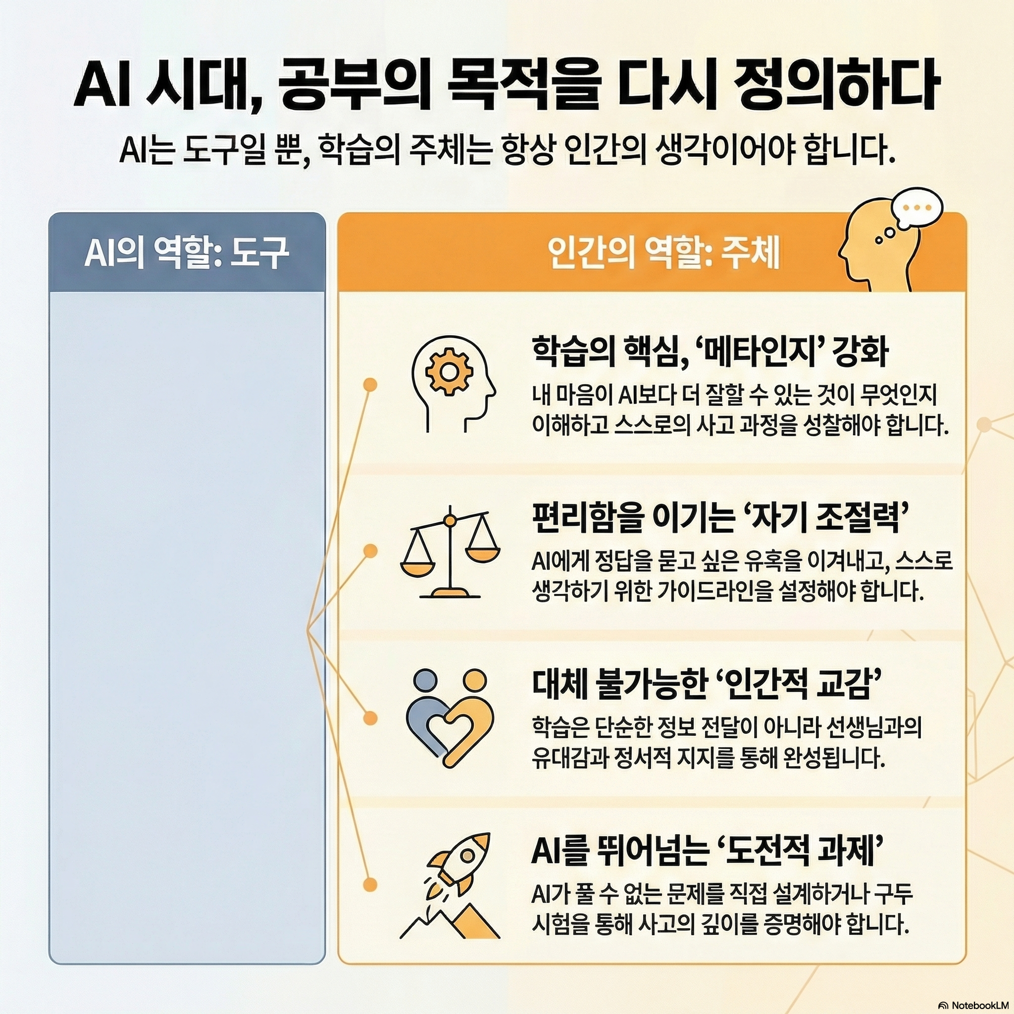 "AI가 당신의 숙제를 대신 해줄 수 있는 시대에, 당신의 마음만이 할 수 있는 유일한 가치는 무엇입니까?"