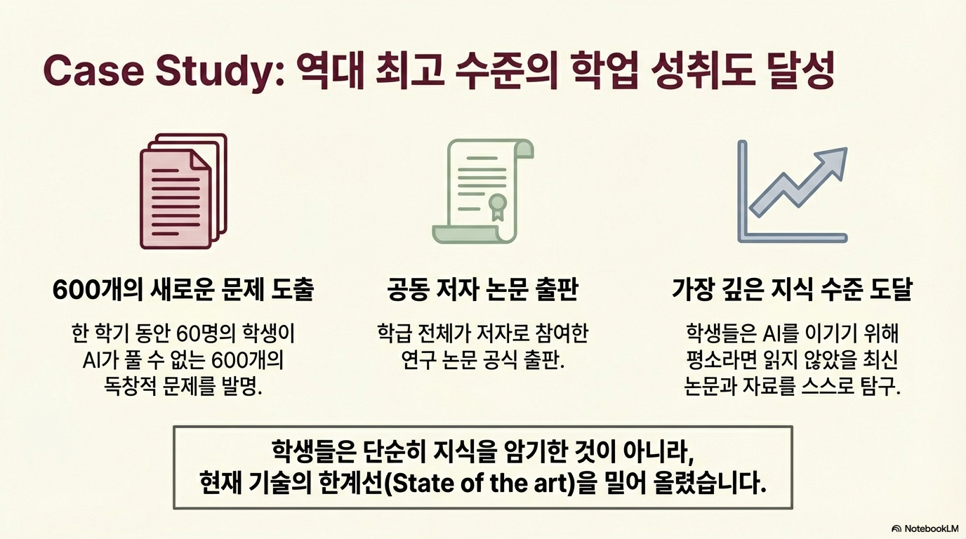 브레너 교수는 과감하게 강의 방식을 혁신했습니다. 학생들에게 문제를 풀게 하는 대신, **'현재의 최신 AI가 도저히 풀 수 없는 문제'**를 직접 설계하라는 과제를 부여한 것입니다. 학생들은 자신이 만든 문제가 AI의 한계를 넘어서는 것임을 증명해야 했고, 그 과정에서 600개의 새로운 난제들이 탄생했습니다. 놀랍게도 이 결과물은 학생 전원이 저자로 참여한 정식 학술 논문으로 출판되기에 이르렀습니다.