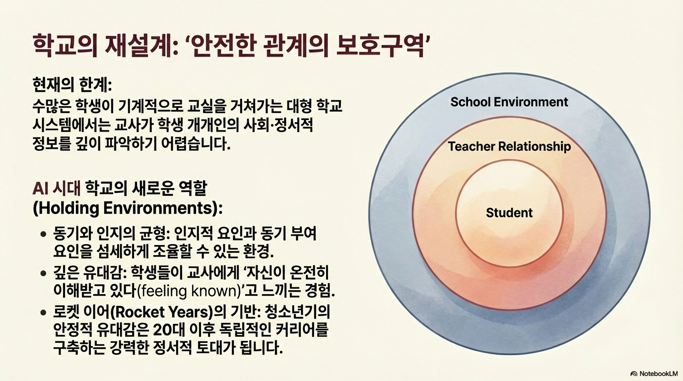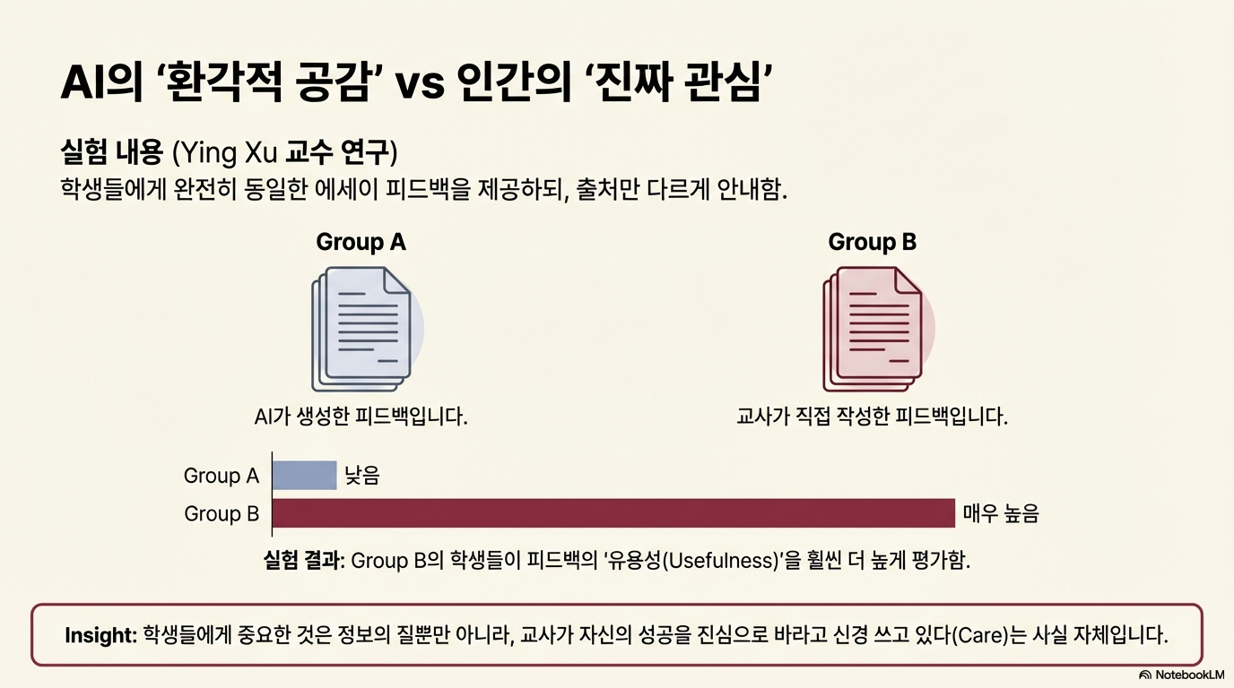 AI 튜터가 아무리 정교한 피드백을 제공하더라도, 인간 교사가 주는 '사회 정서적 연결'은 대체 불가능합니다. 잉 쉬 교수의 실험에 따르면, 학생들에게 동일한 내용의 에세이 피드백을 제공했음에도 불구하고, 그것이 AI가 아닌 '교수님'이 직접 준 것이라고 믿을 때 학생들은 훨씬 더 큰 유용성을 느꼈고 학습 동기 또한 높게 나타났습니다.